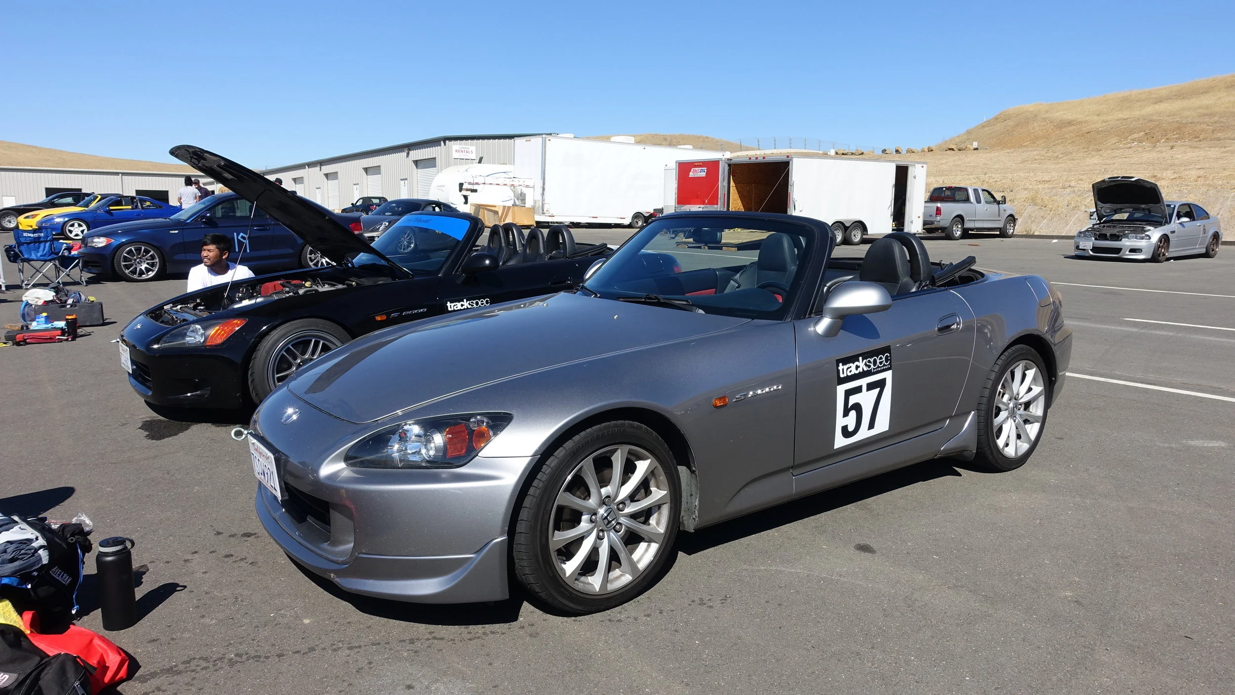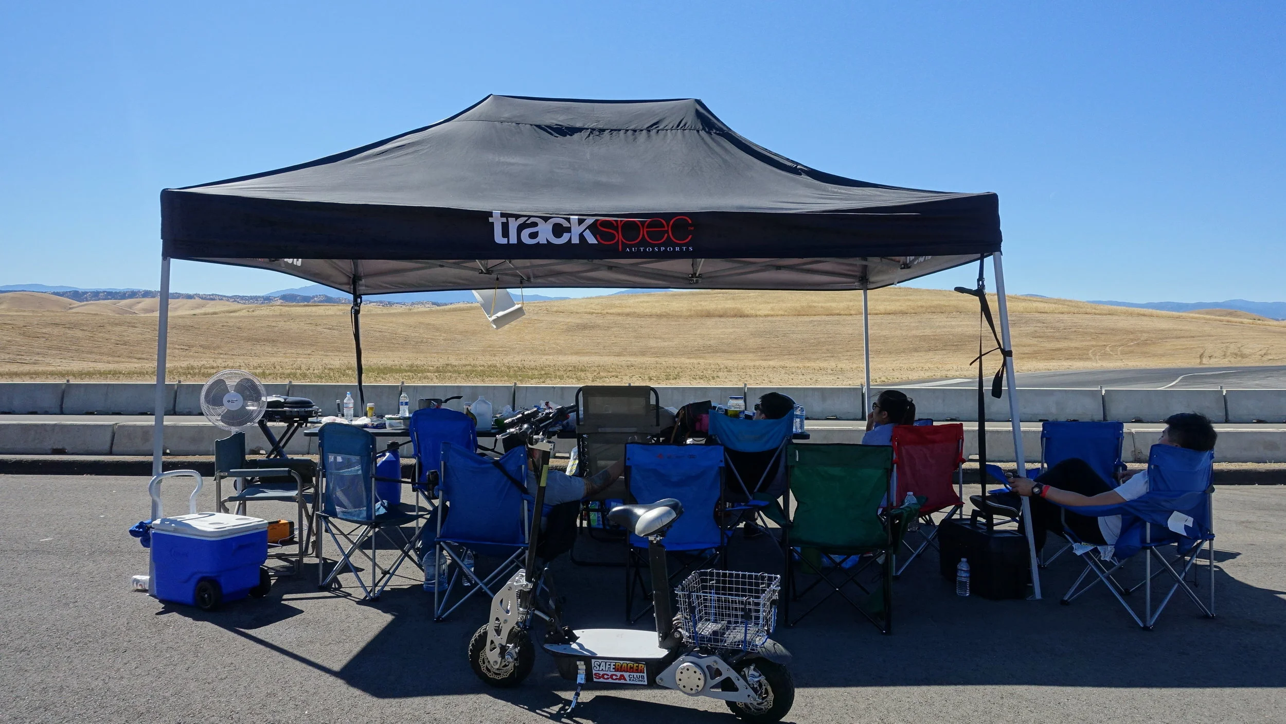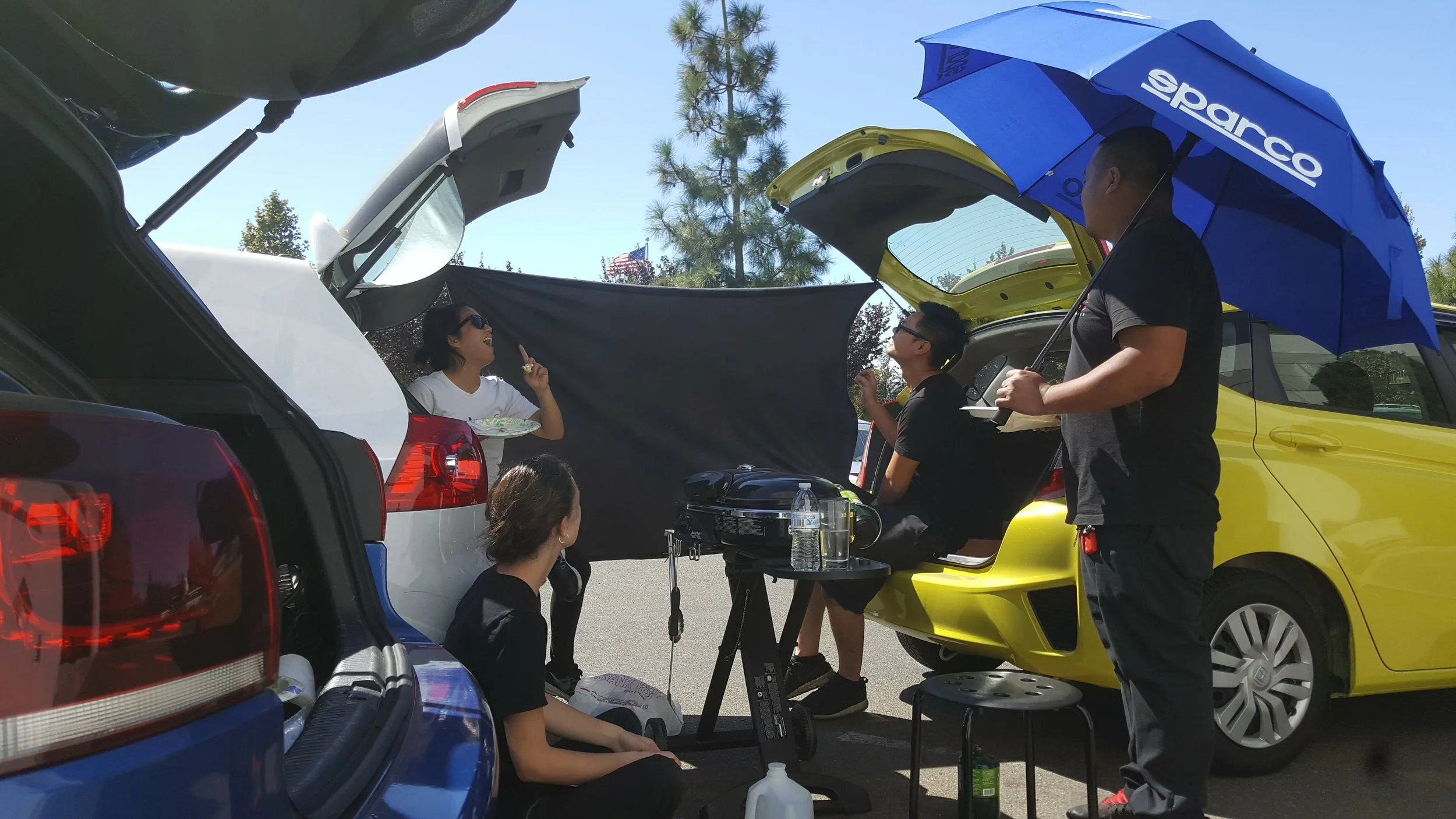 We had a BBQ on the racetrack for Jon's birthday and we came back with tons of leftovers. So that entire week, we BBQ'ed for lunch. But it was so hot, we started using our hatchbacks for shade.