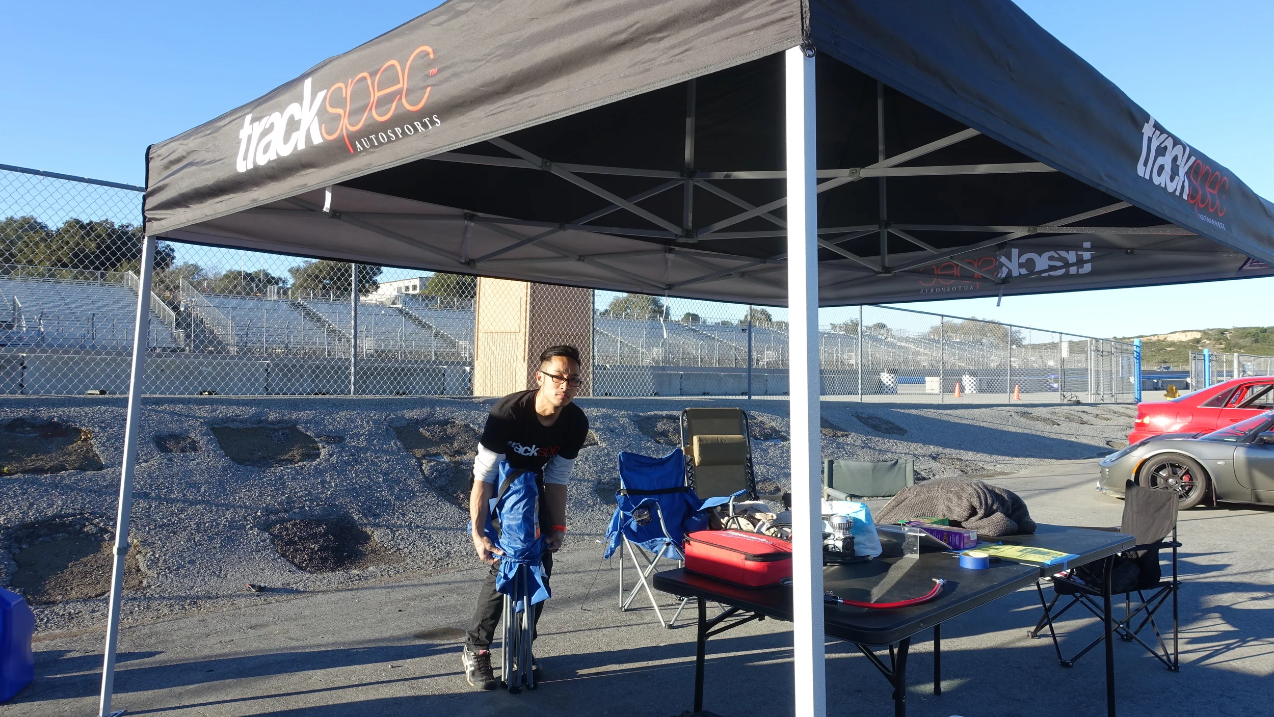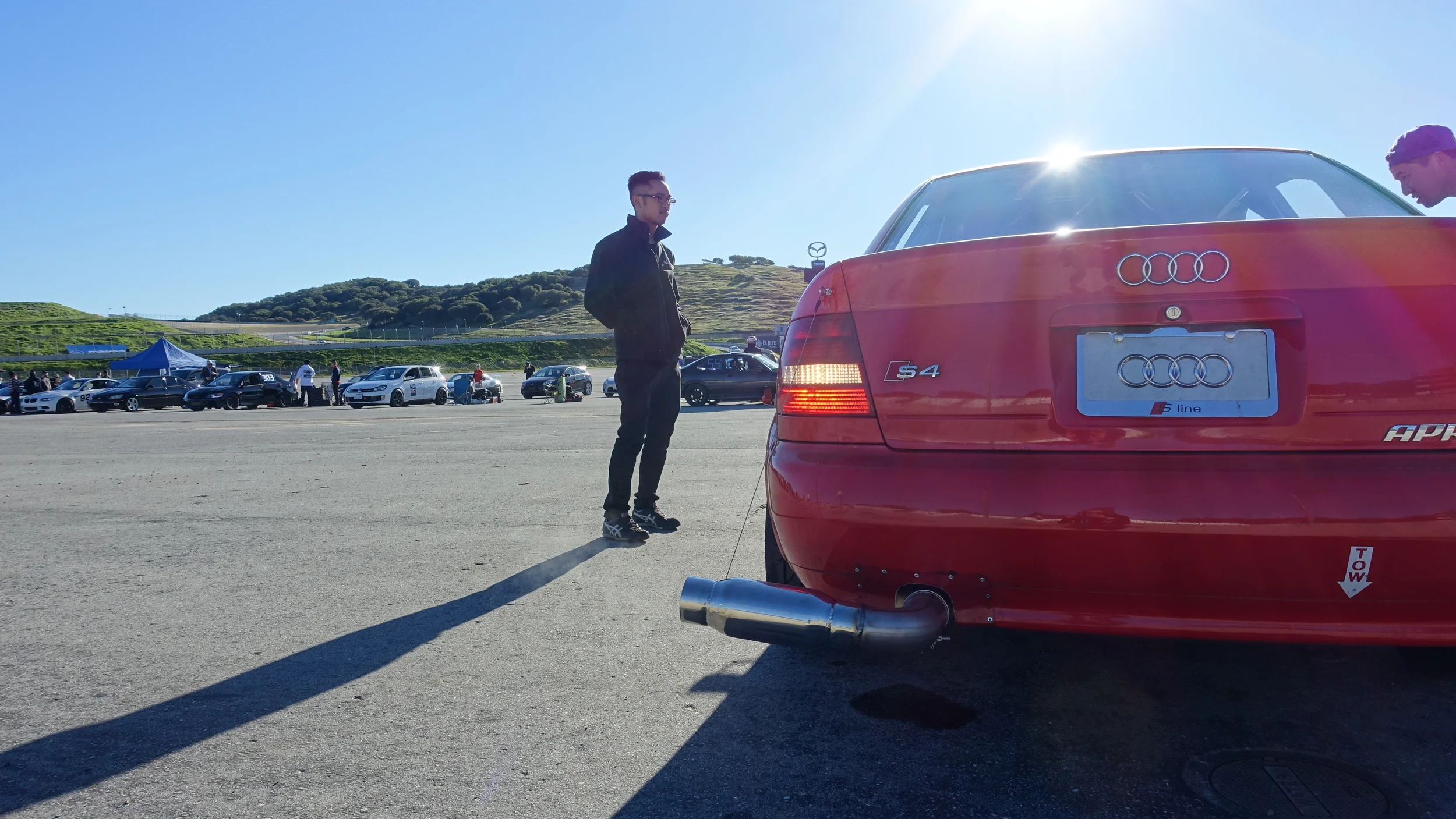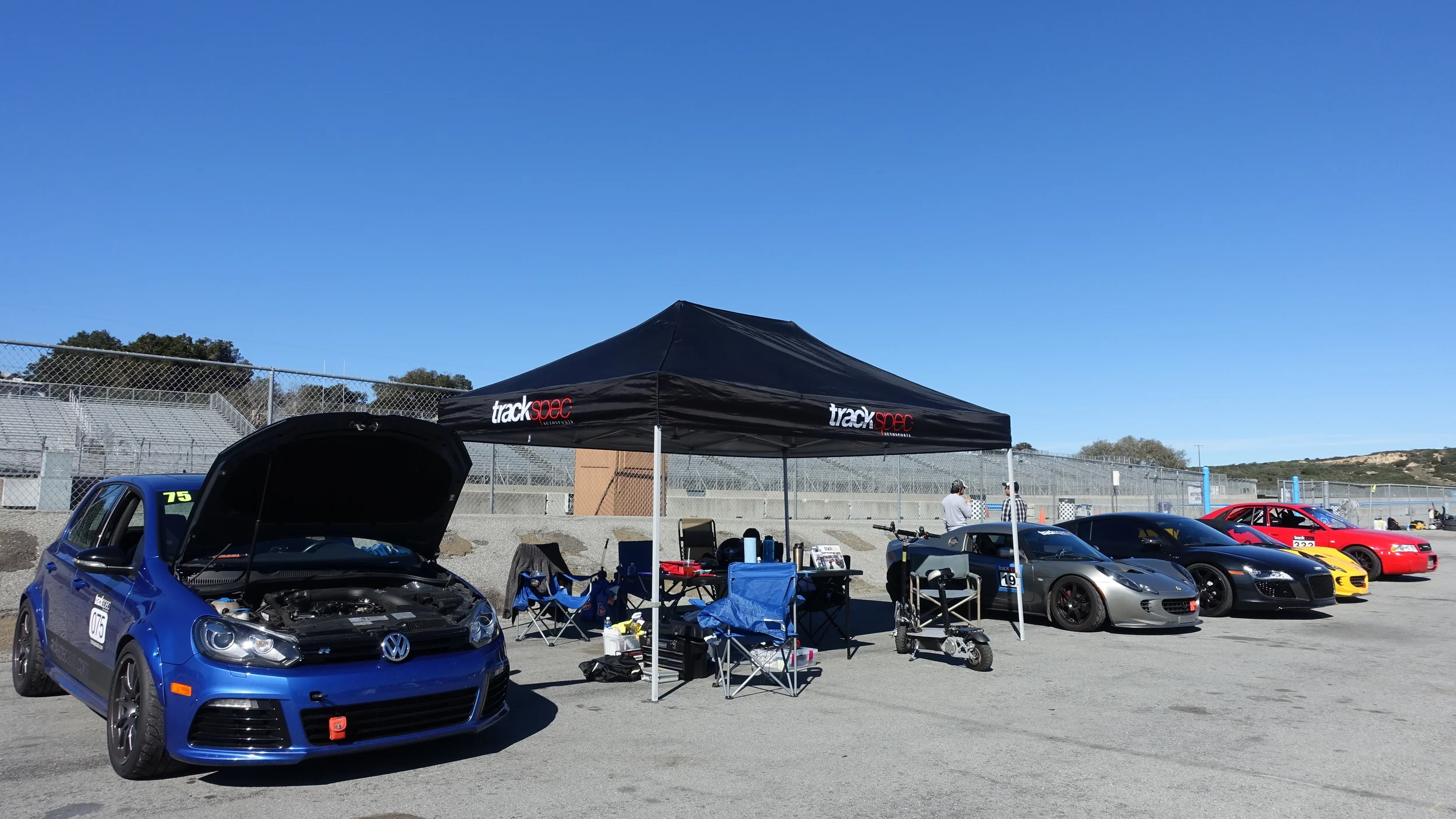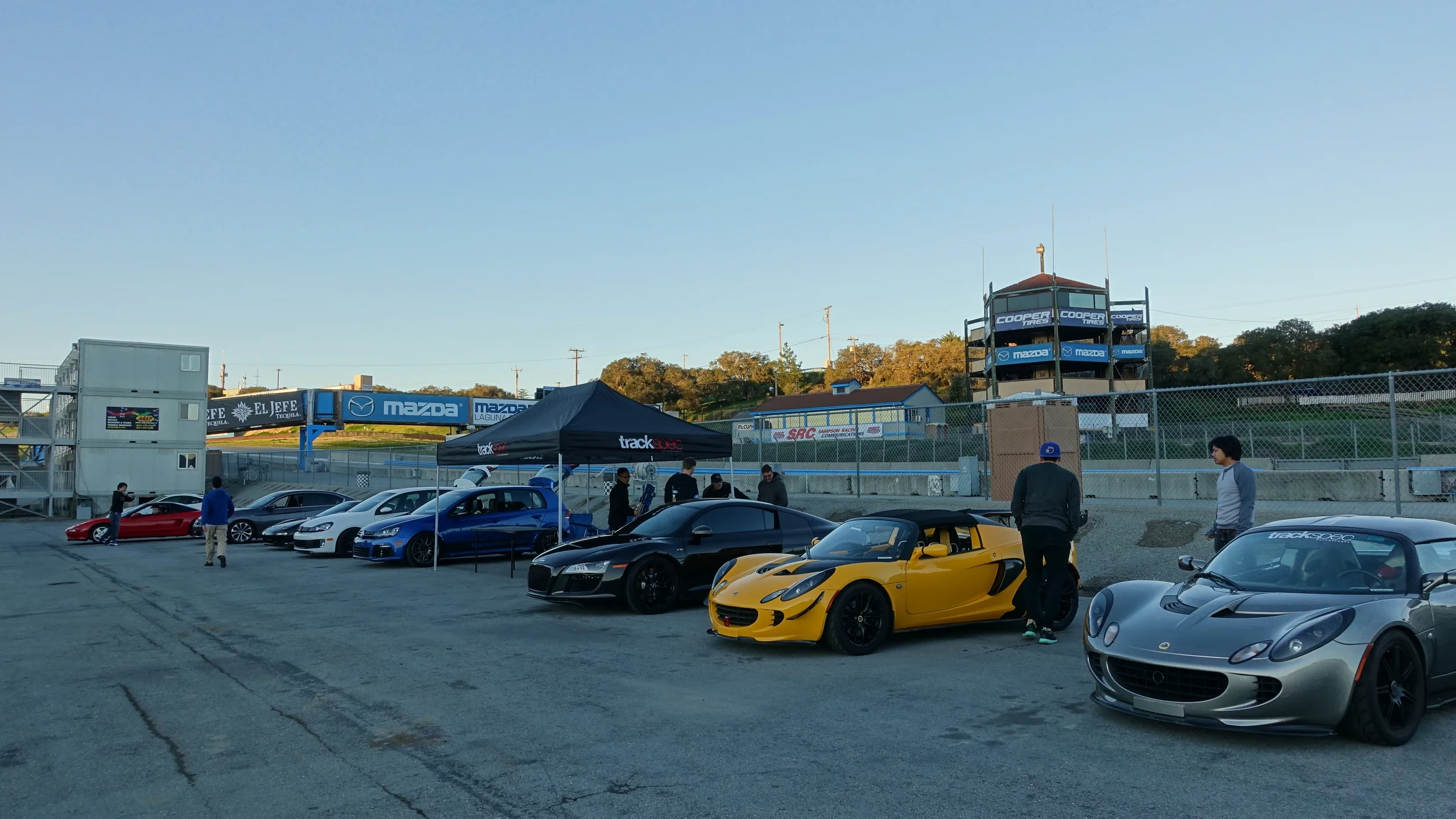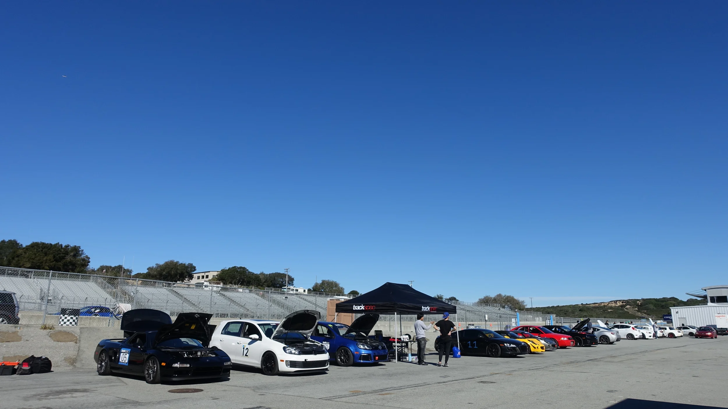 You can park pretty much anywhere in the paddock. If you're still waiting for friends, you can reserve their spot with a chair. Parking is never really a problem, however, it can be a little crowded if the organization also hosts an AutoX nearby---which takes up a huge chunk of Laguna's paddock. We make it work.