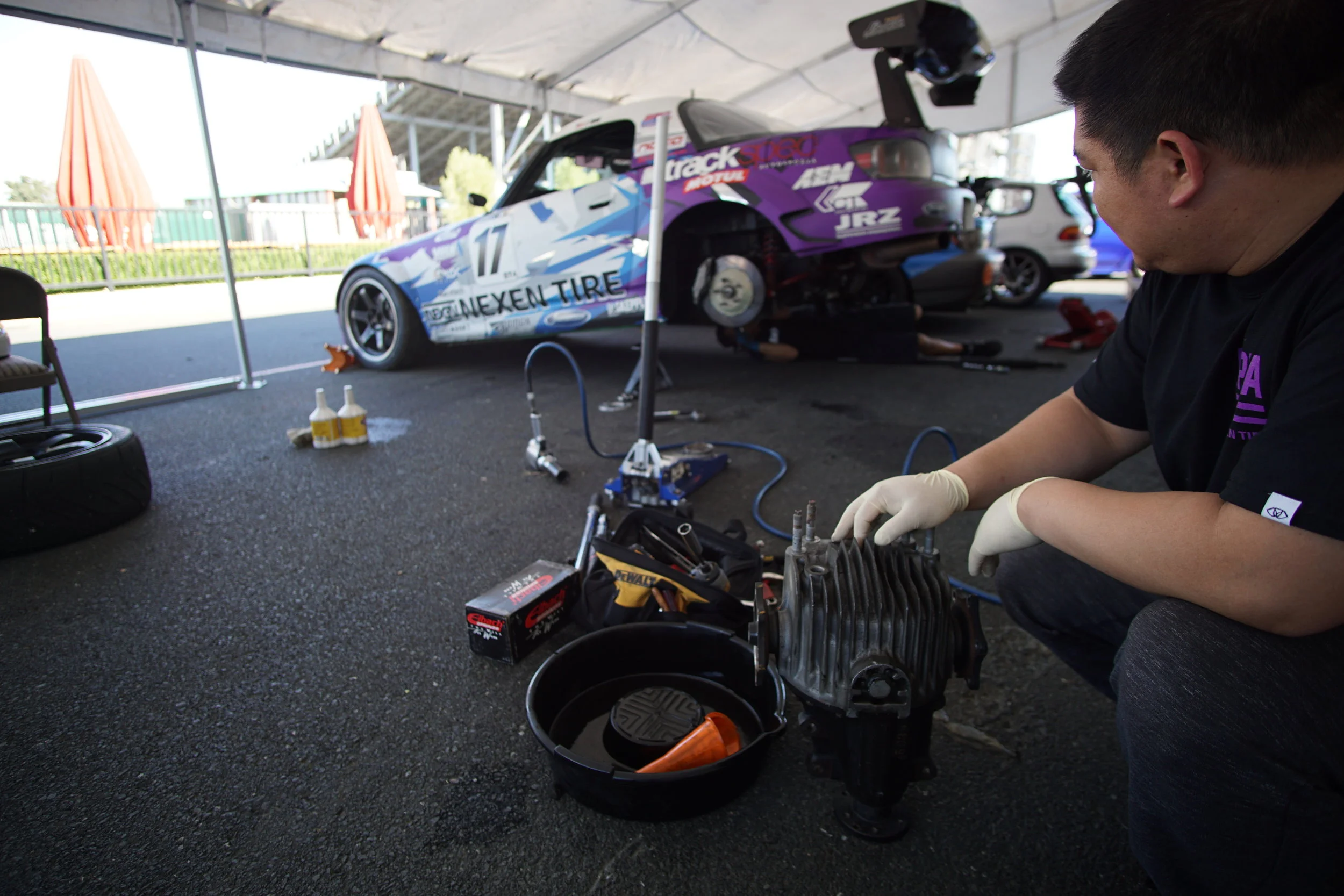 Graham ripped back out onto the track, but then 2 laps later he came right back in. He said the spare differential had also broken. We were super puzzled...until we jacked up the back to find that the drain bolt was missing. All of the fluid had leaked out, and the parts inside had seized together. We had a third spare rear differential, but decided with the amount of time remaining that it wasn't worth the scramble because we would've only had a few minutes left to complete laps before the end of the endurance race. We decided to clean everything up, get organized, and then get both cars ready for Sunday's race after dinner together at the NASA BBQ.