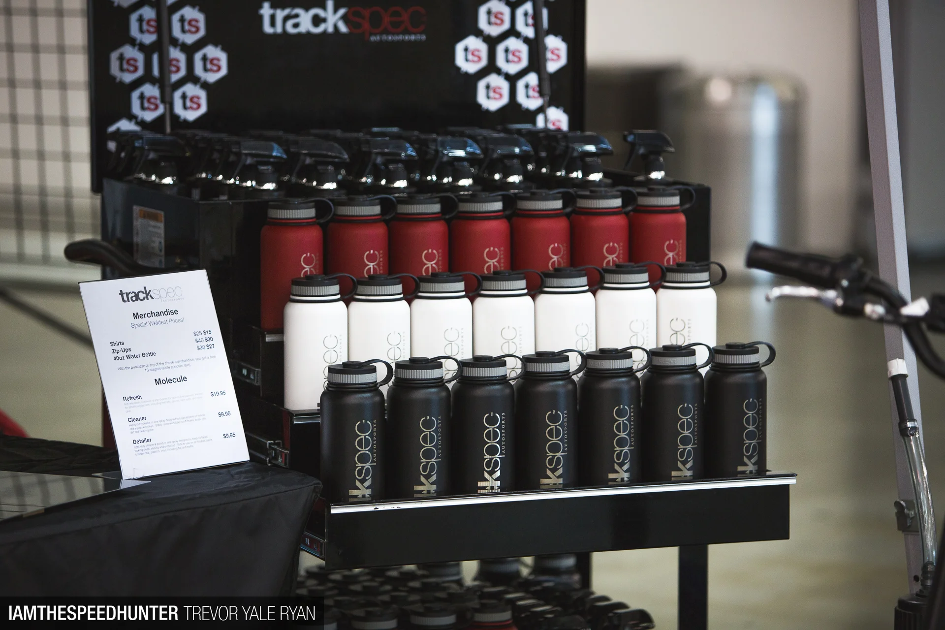 So we thought, "Okay, it's possible we are going to stand out in this crowd. Might as well go all out." Jon decided we would stay loyal to our brand and do a track-themed booth. We displayed empty fuel jugs, our personal helmets and race suits, and our trackside scooter. We emptied Jon's very own tool cart, which he uses daily, and used it as our display case for our water bottles and Molecule. And lastly, all the cars we chose were track rats...cars that have gotten down and dirty on the racetrack.