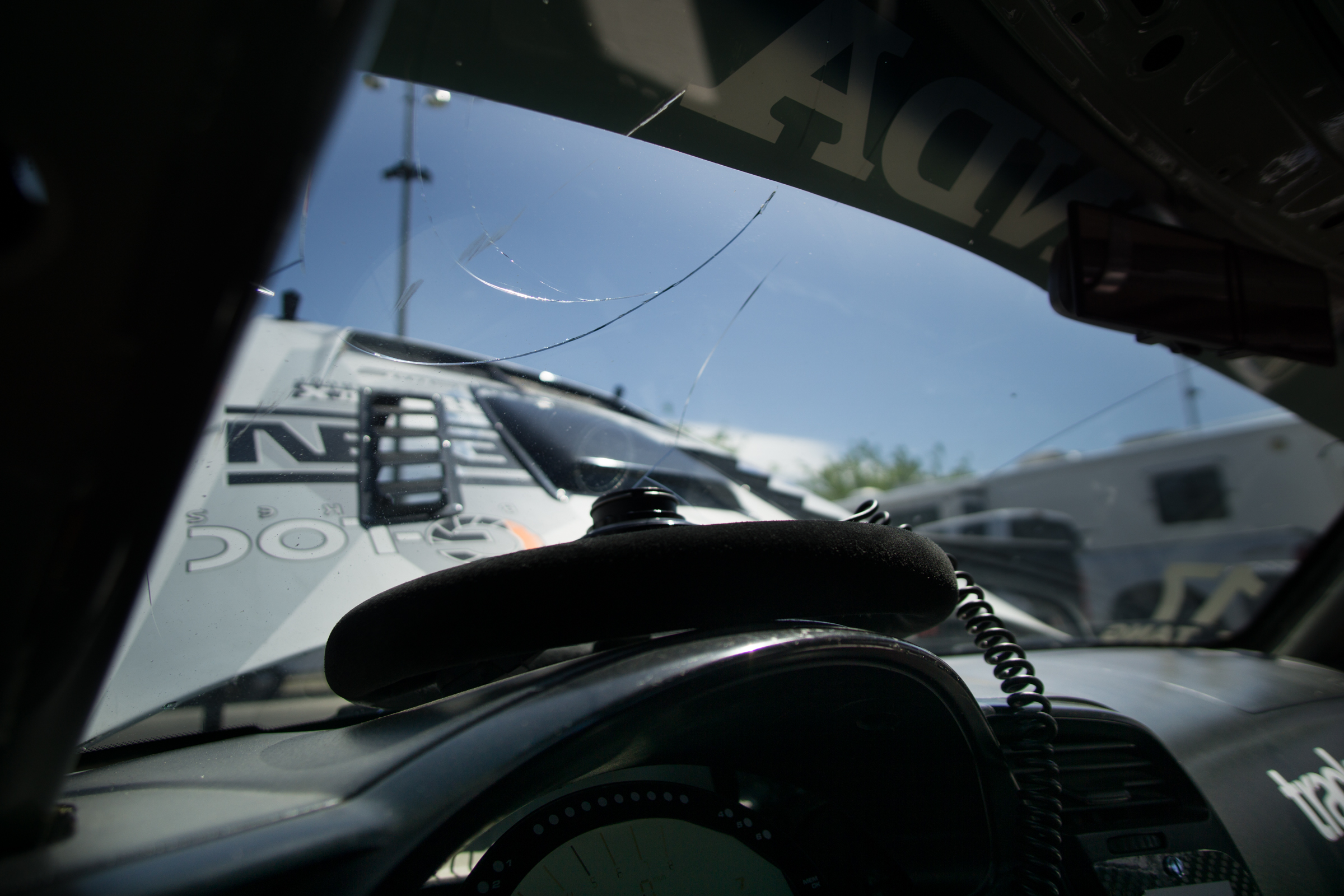 Unfortunately, I made a mistake during qualifying and it was a costly one. I was super committed to a flying lap and I came up really fast on a Legend Car into T8. I thought I would have enough room to squeeze around him, but he checked up super hard and in order to avoid fully rear-ending him I drove off the track. Doing so meant I broke off 1/3 of my front splitter, which subsequently flew up and cracked my windshield. Doh!