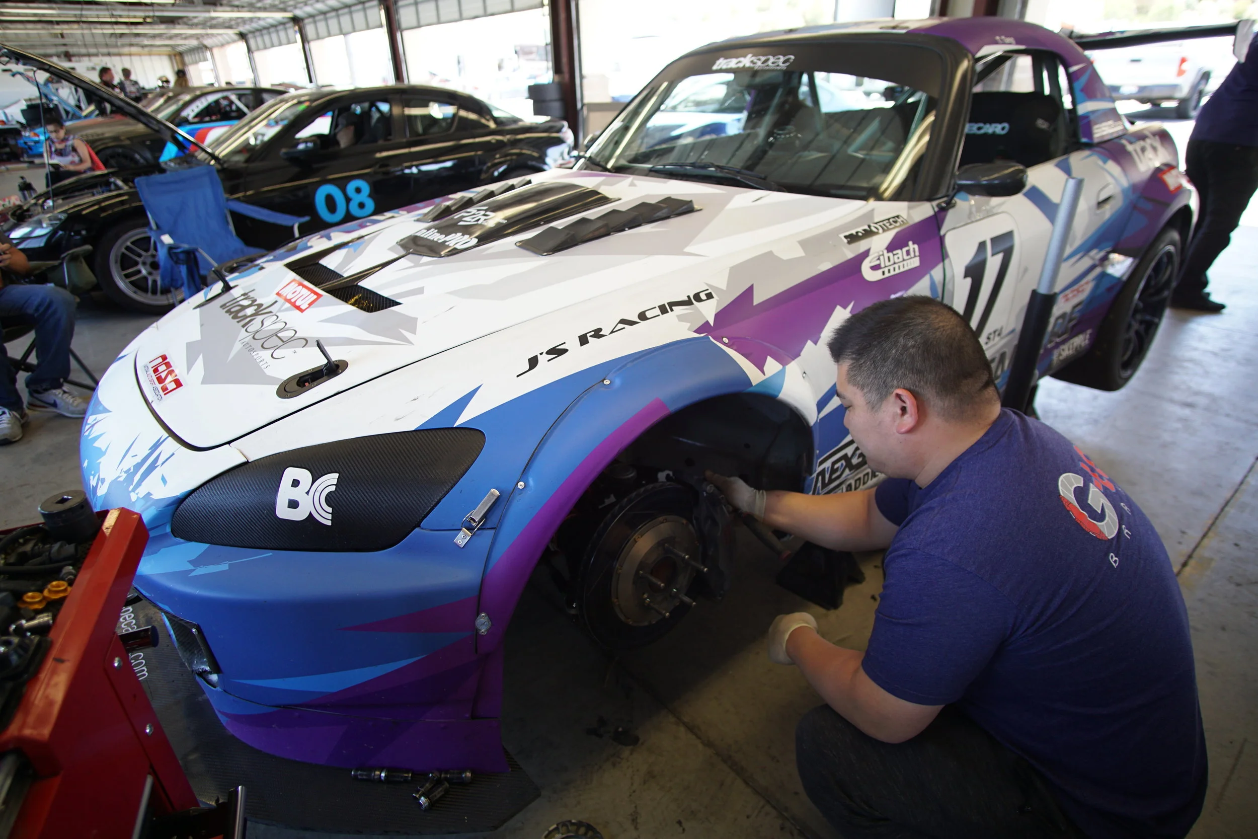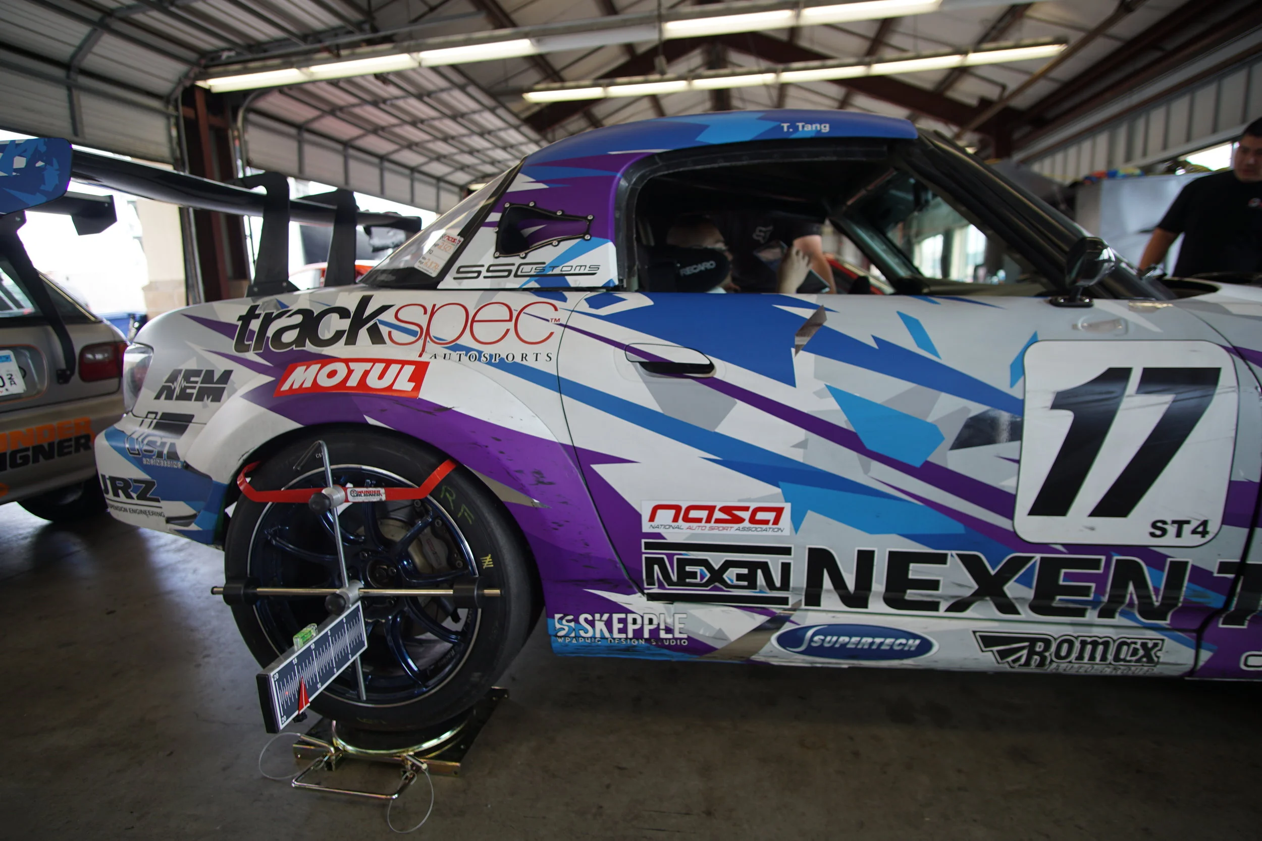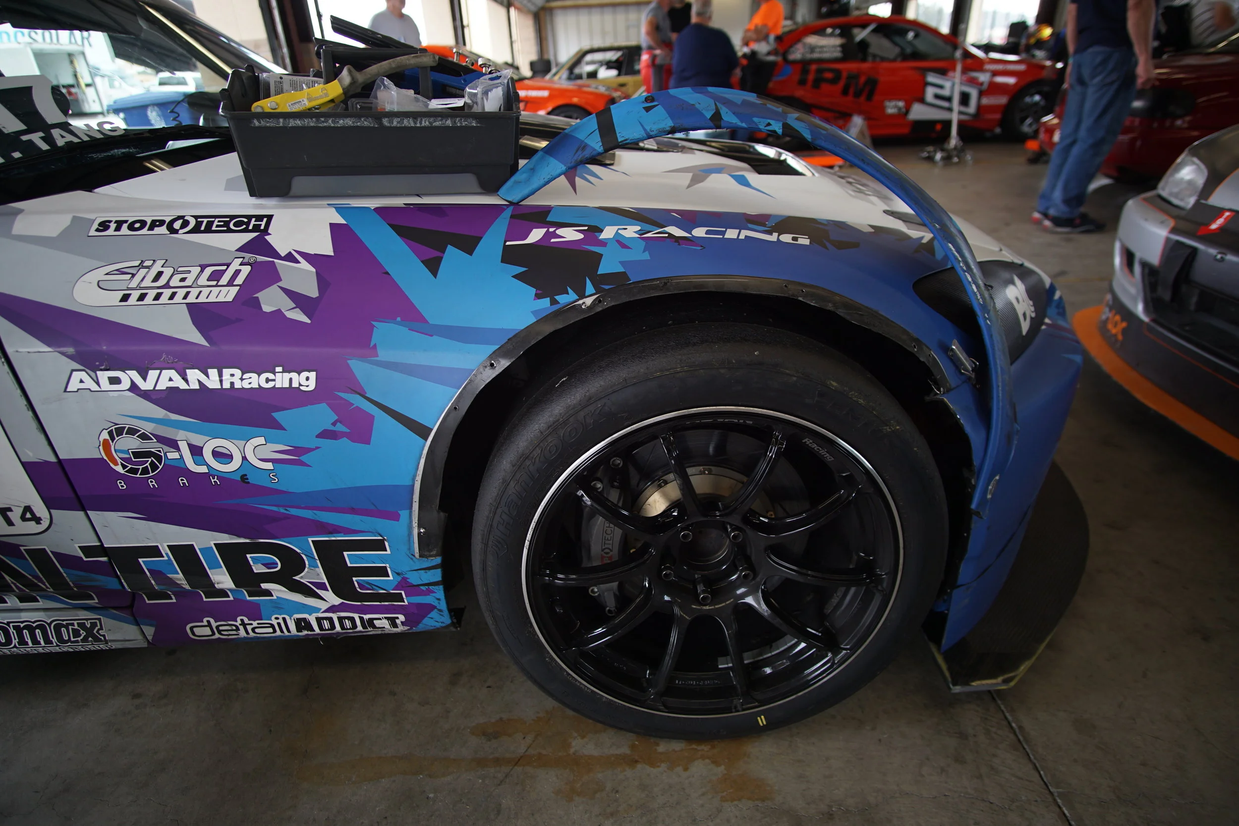 The next day, I was excited to be back in action and to have the car in fighting form. I ran the 3rd fastest time overall in morning practice. Then, during qualifying I made a minor mistake and got too close to the tire barriers at T11. I clipped one stack and accidentally knocked off my fender flare. I also tweaked my alignment. Oops.