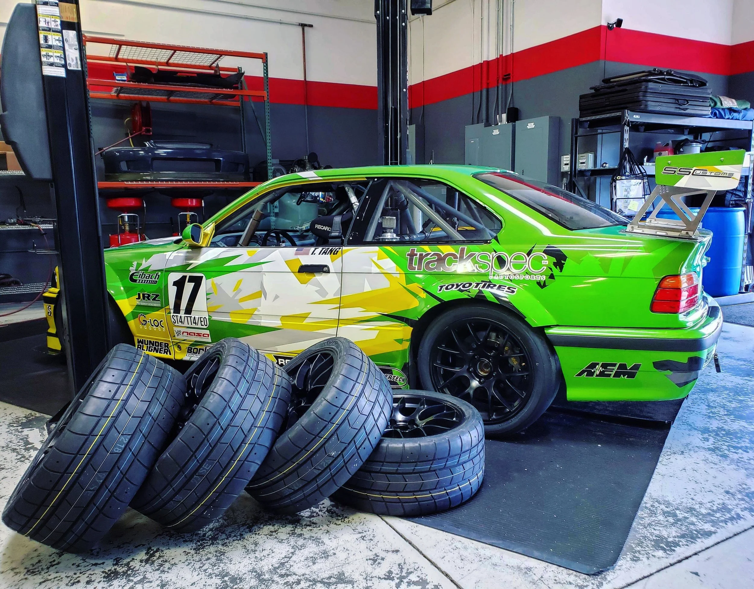 We added new camber shims and swapped to different Eibach springs (thanks, Jeremy, Mark, and Tony!)