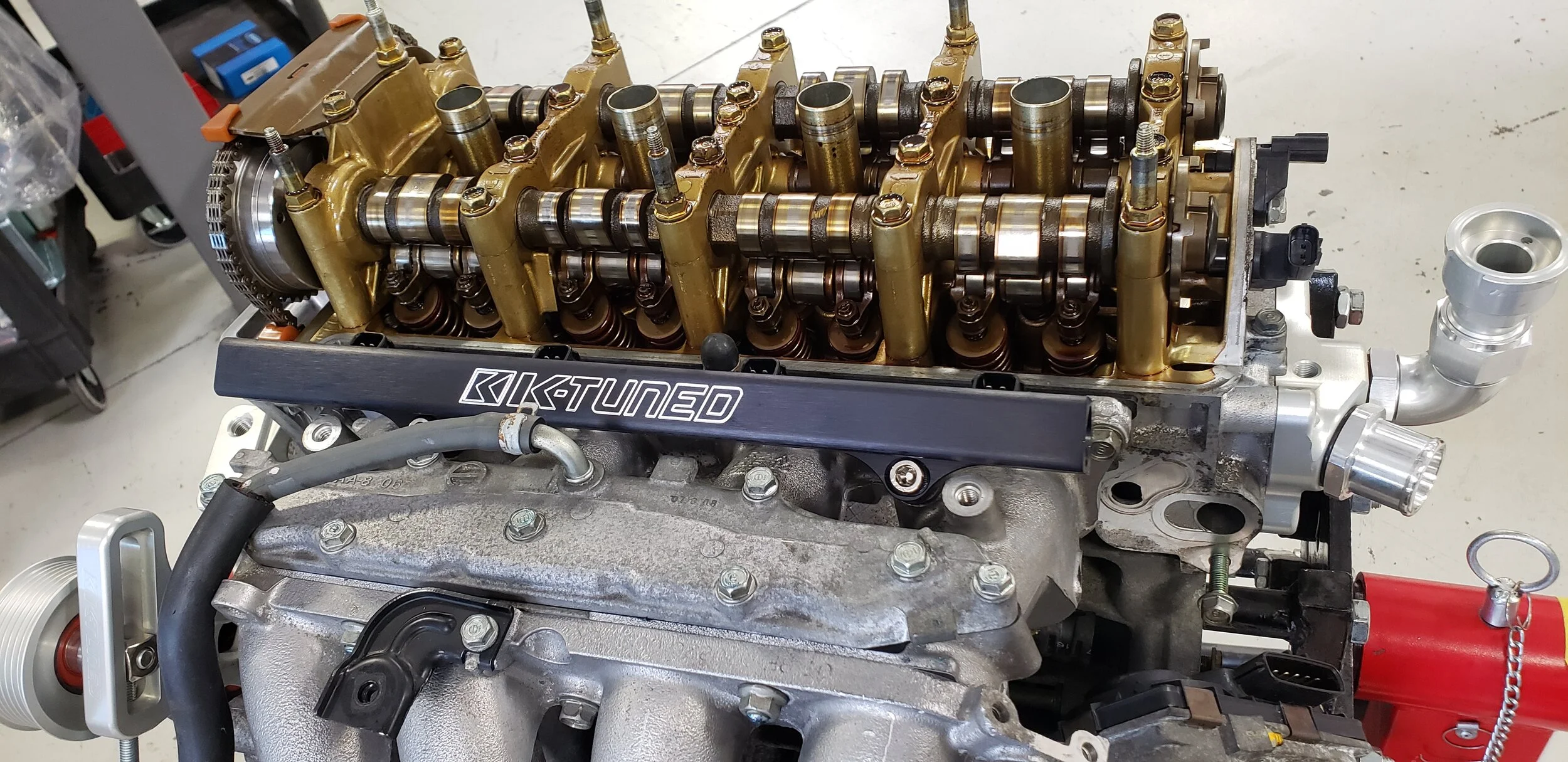 A K-Tuned fuel rail was installed to accept universal AN fittings and the fuel pressure sensor.