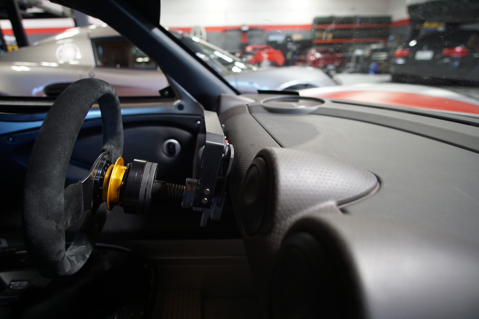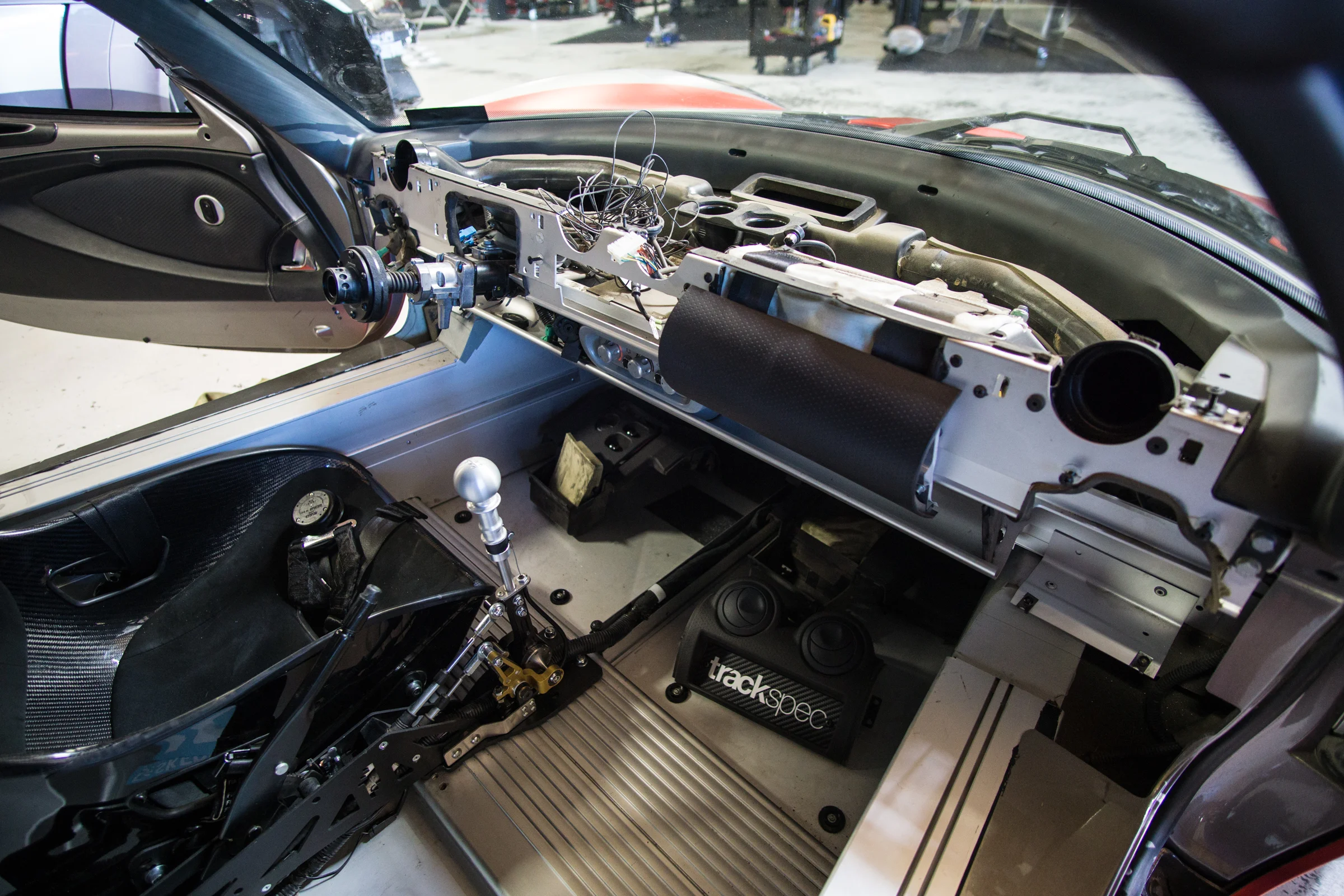 I replaced the driver’s side switch panel with a Euro (3 Switch) panel and kept the factory push start button in it’s original location. I also retained the factory light switches, in case we decide to do any endurance racing with the car. In the middle row is the new ignition switch and a fuel pump over ride switch. A fuel pump over ride switch in conjunction with dry break fittings on the fuel lines allows for quick and easy fuel removal. This is convenient for 2 reasons:
