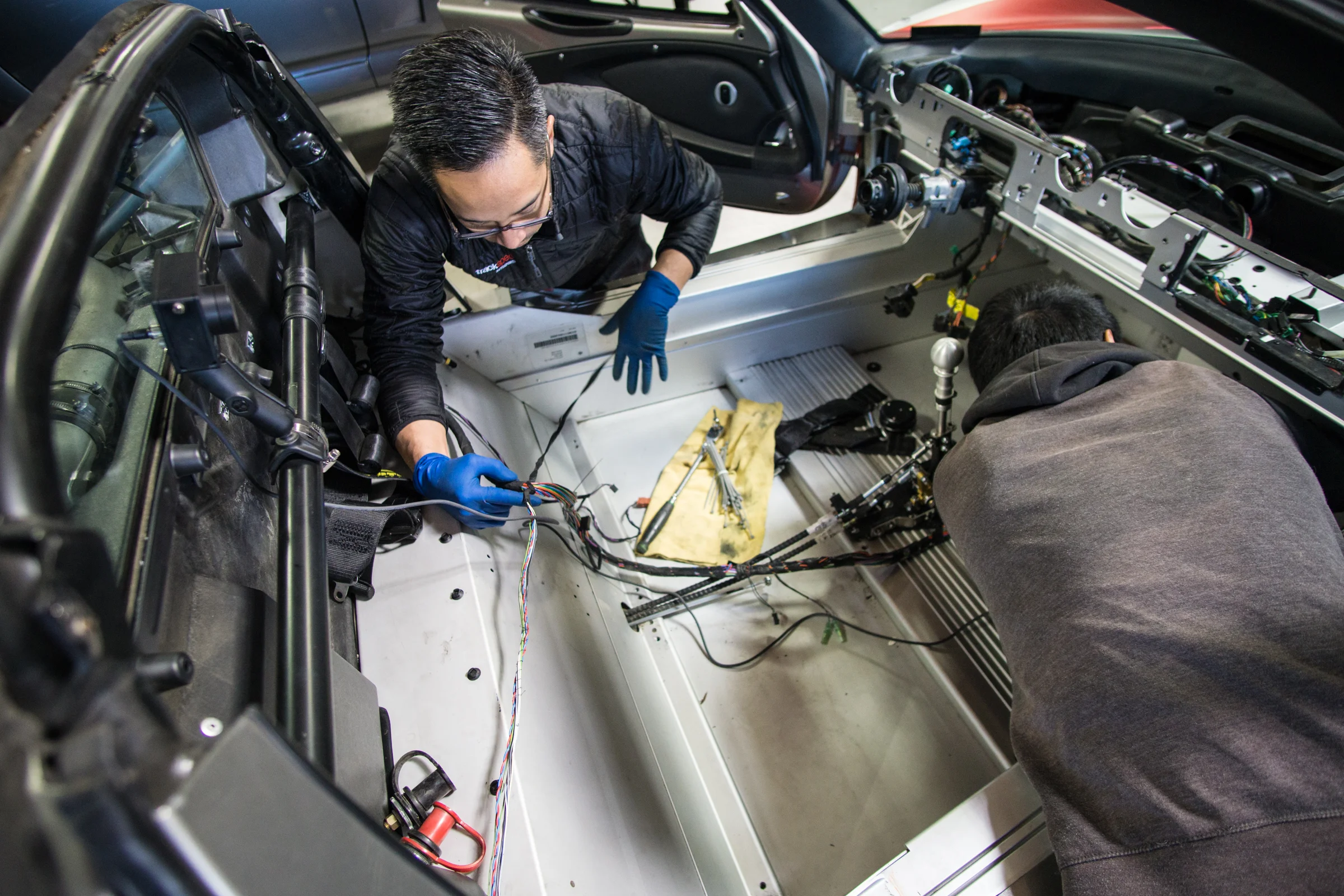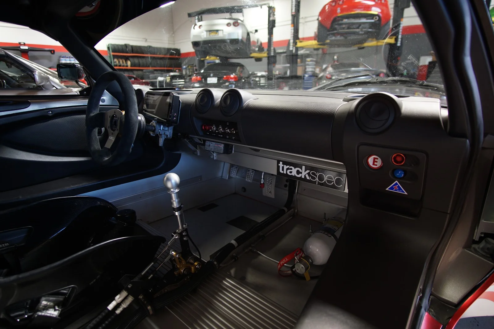 Most sanctioning bodies require that the steering wheel lock is disabled or removed, so this was also a good time to wire in the switch panel as the steering wheel lock/key cylinder actuates the ignition switch. If you haven’t already noticed, the interior is symmetrical so that Lotus could use the same interior parts for left hand drive or right hand drive cars. I moved the original switch panel from the driver’s side to the passenger side for the battery kill and fire suppression system switches. Per most regulations, there should be a set of “interior” and “exterior” switches. If the switches are not on the exterior of the car, they need to be at least accessible from the exterior. This allows a safety marshal to shut off the engine or activate the fire system if the driver is not able to in an emergency situation.