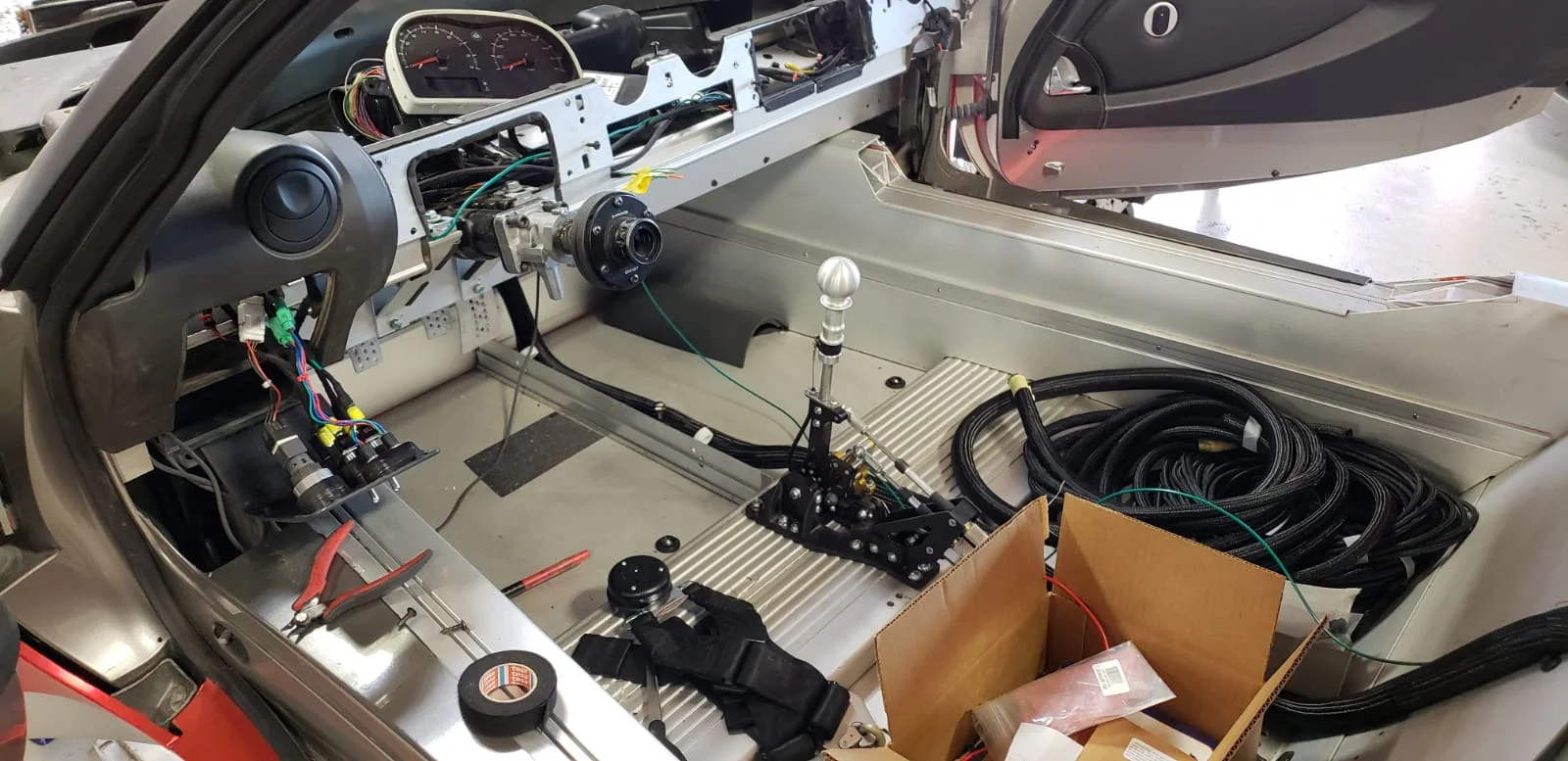 With the AiM dash logger on the way, I decided that it was a good time to do some wiring work on the car. I started by thinning the chassis harness and removed all the unnecessary wires and modules. This included the SRS, alarm, stereo, and central door locking system. While I was at it, Herb removed the parking brake mechanism and installed Inokinetic’s hand-brake delete bracket option for their ShiftR111.