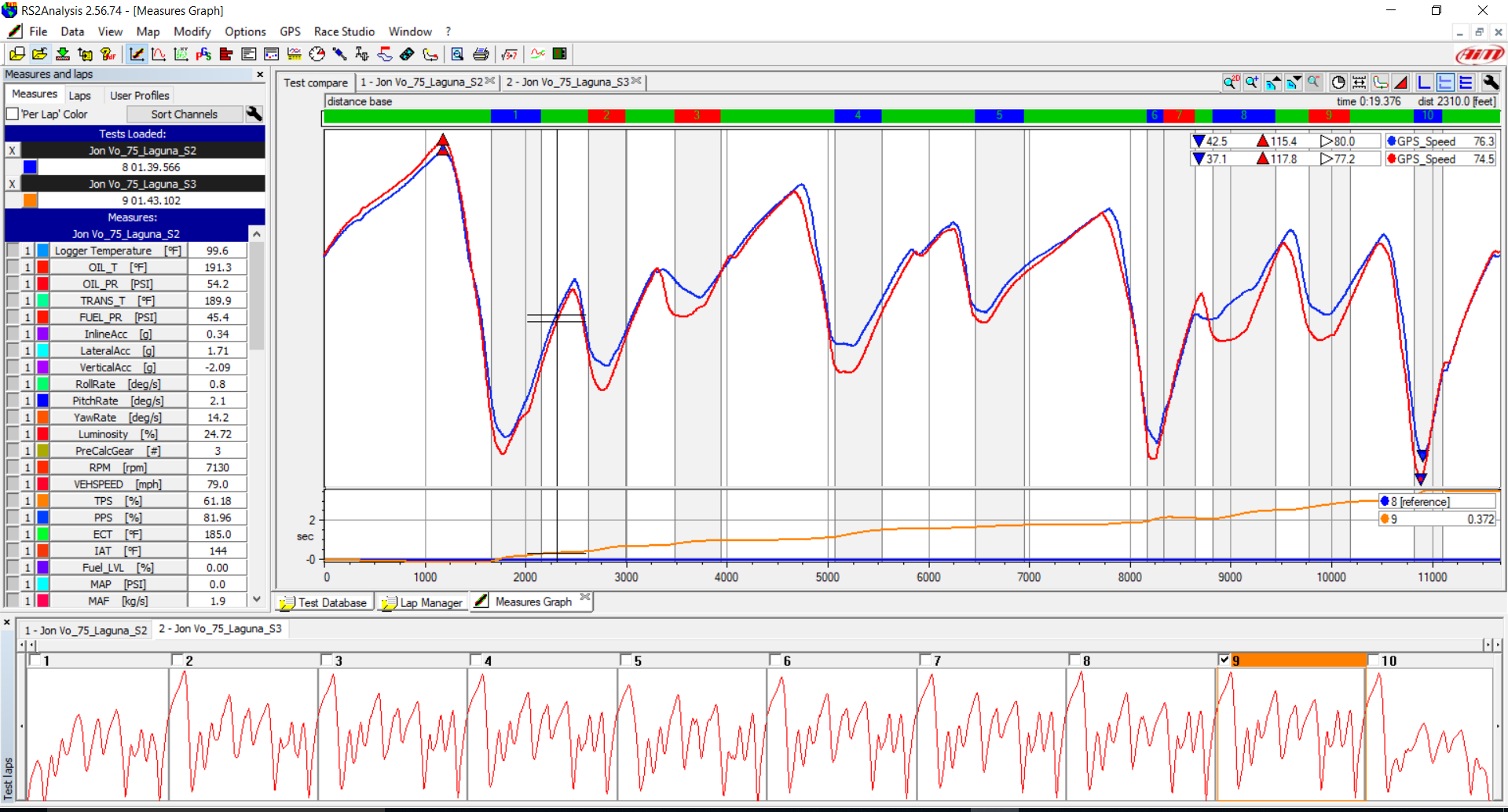 AiM GPS speed data comparison between no wing and RE71s (Red), and with the wing and the Z214s (Blue)
