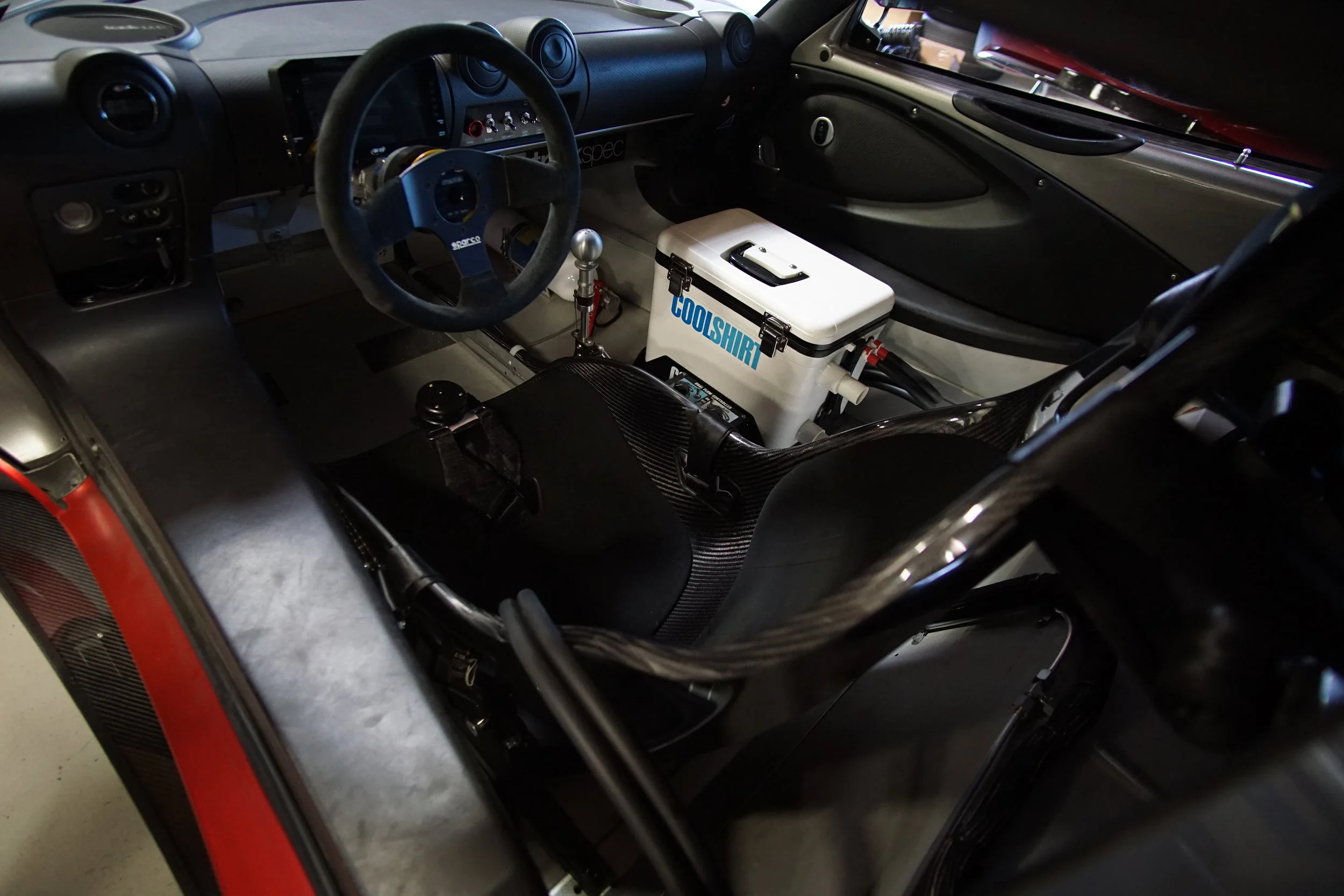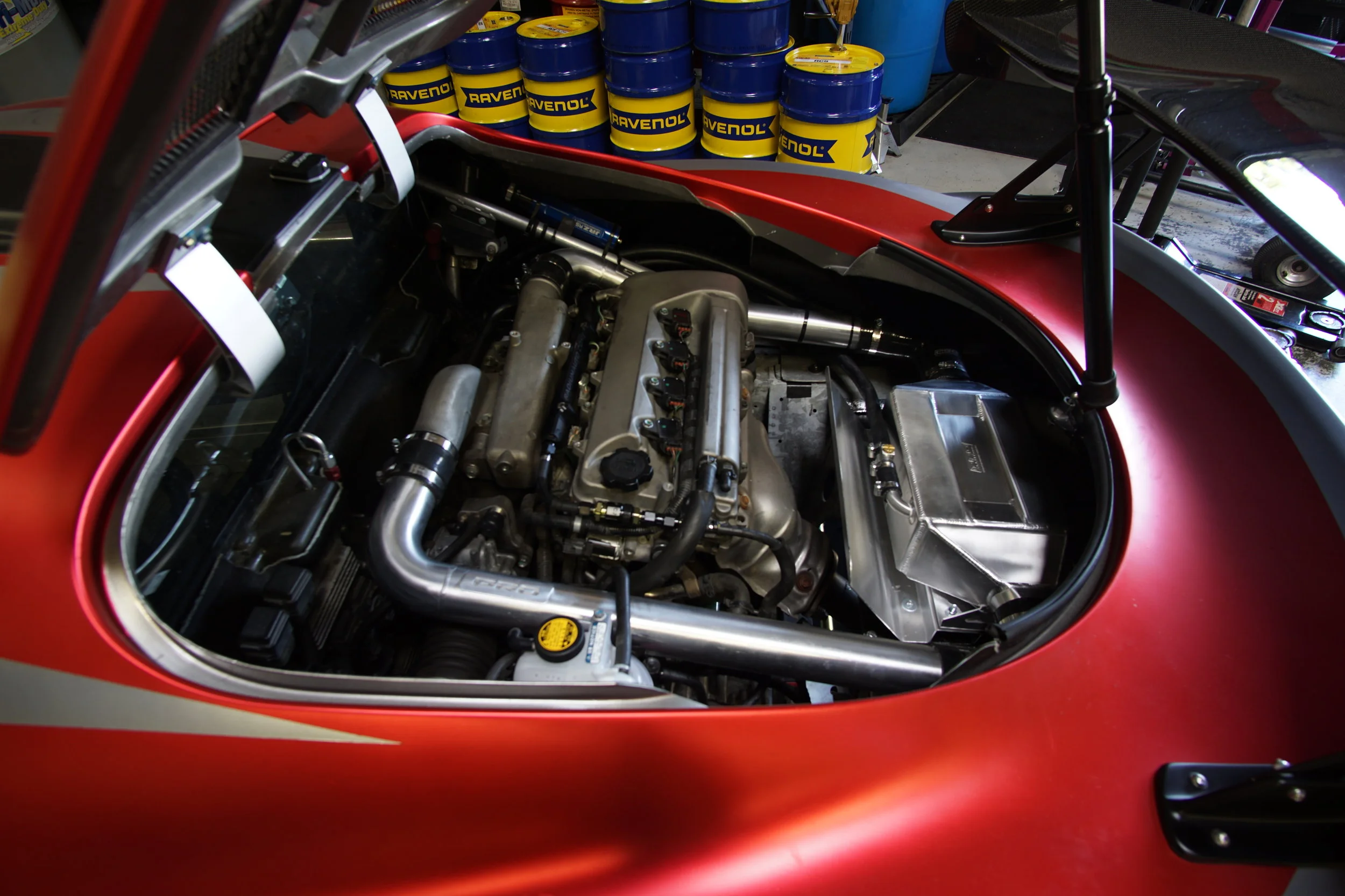 We decided to go with an water-to-air system by Pro Alloy to help keep our IATs in check. The system replaces the standard air-to-air intercooler for a water cooled unit. A water pump circulates and transfers the heat to an auxiliary radiator at the front of the car. We went with the kit designed for the Lotus 211, which mounts the charge cooler in what used to be the trunk. This moves it away from the rising heat produced by the engine, gives us a little more visibility out the back window, and makes working on the engine a little more accessible.