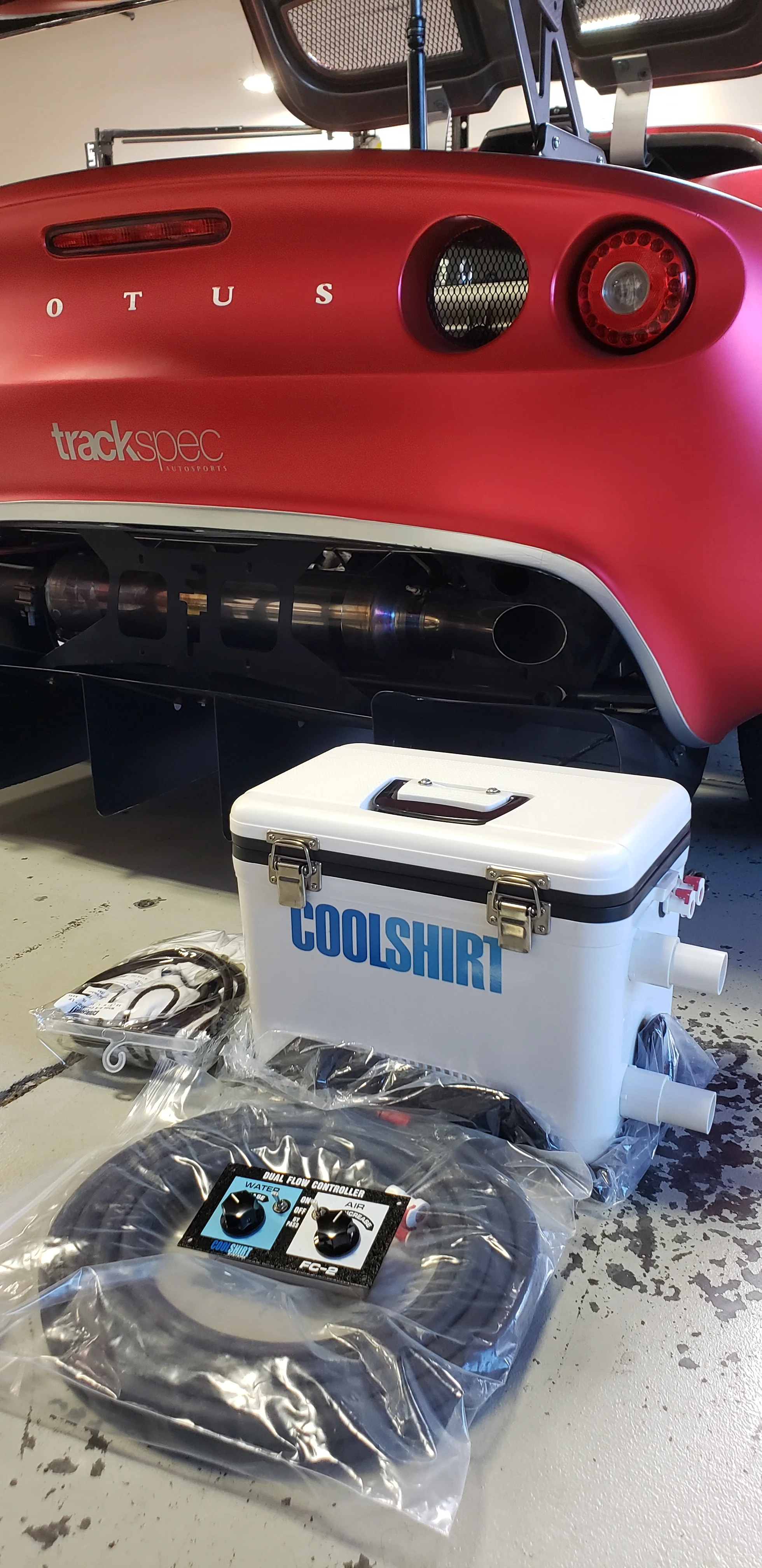 With a 107F forecast on our upcoming Buttonwillow track day, it was a good excuse to install a CoolShirt system. The system is simple yet effective. You have a cooler with a built-in water pump that you fill with ice water, you wear the CoolShirt that has a hose sewn into it and connect it to the cooler. The pump will circulate the cold water through your shirt to help regulate your body temperature and prevent dehydration on hot days. The kit also comes with a helmet fan which will blow fresh air into the cooler through an aluminum tube and into the top of my helmet. Unfortunately, being a last minute purchase, the helmet blower parts did not arrive in time for the track day. (Special thanks to Wine Country Motorsports for piecing a kit together for us just so we would have something for the track day!)