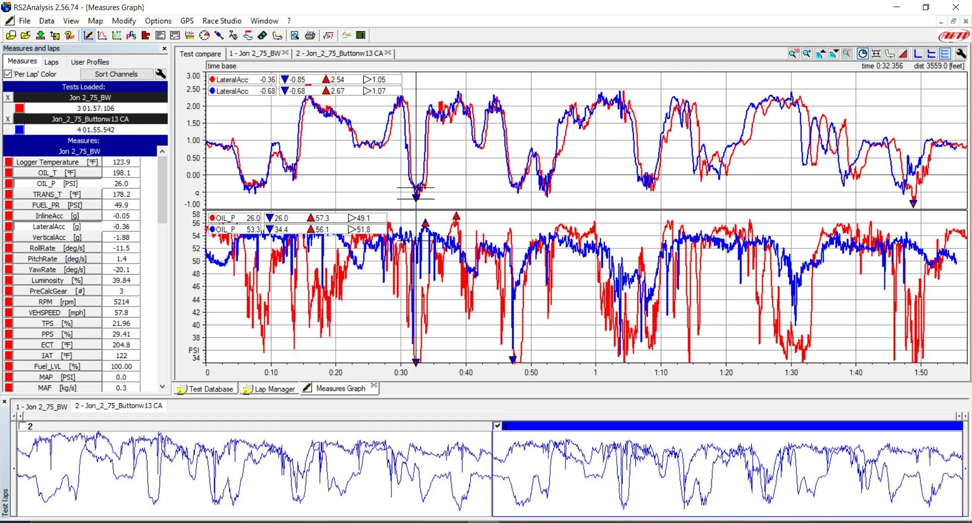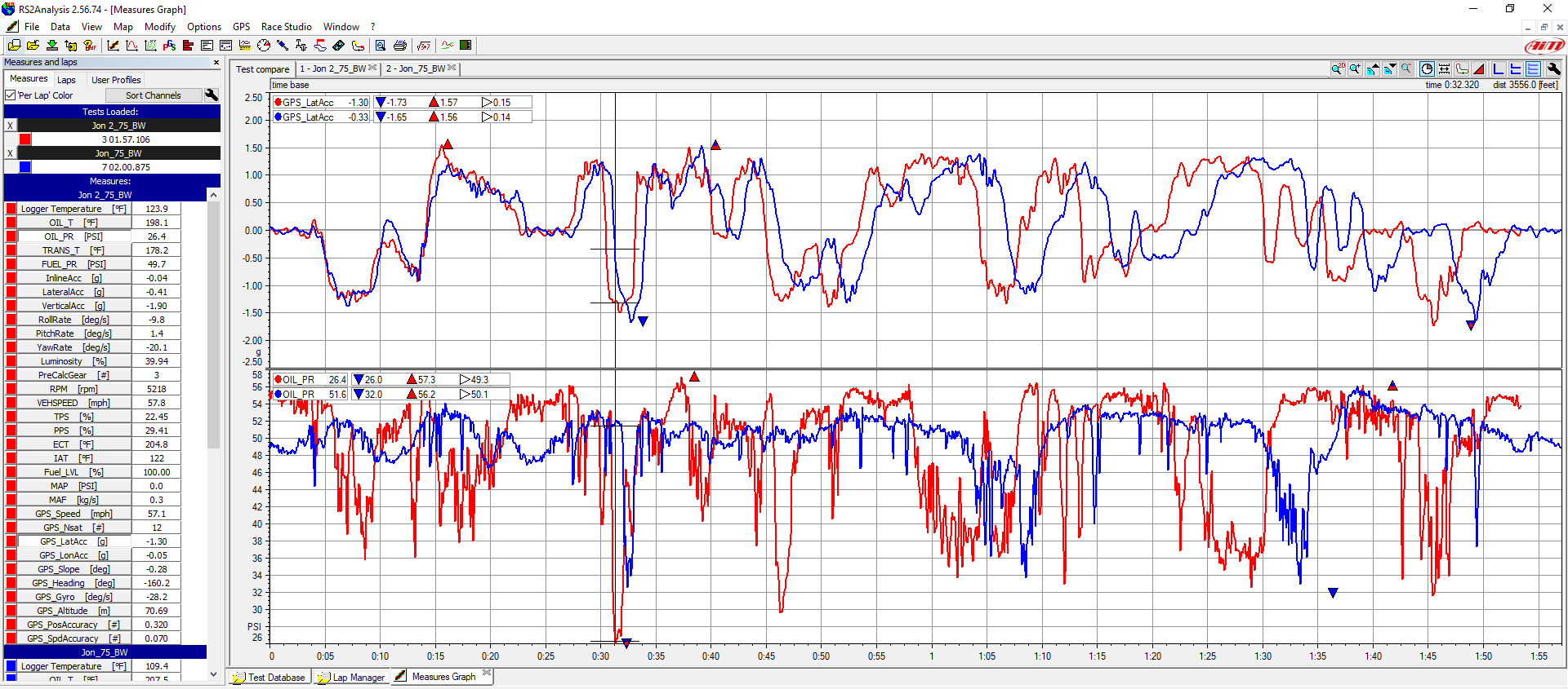 We later took the car back to Buttonwillow and got a better comparison on the oil pressure data. In the graph below, we compare the previous 1:57 lap (Red) with no Accusump to a 1:55 lap (Blue) with the Accusump. We can see that when Red dropped to a low of 26 psi, Blue maintained 53 psi, all while pulling about 0.3 G more.