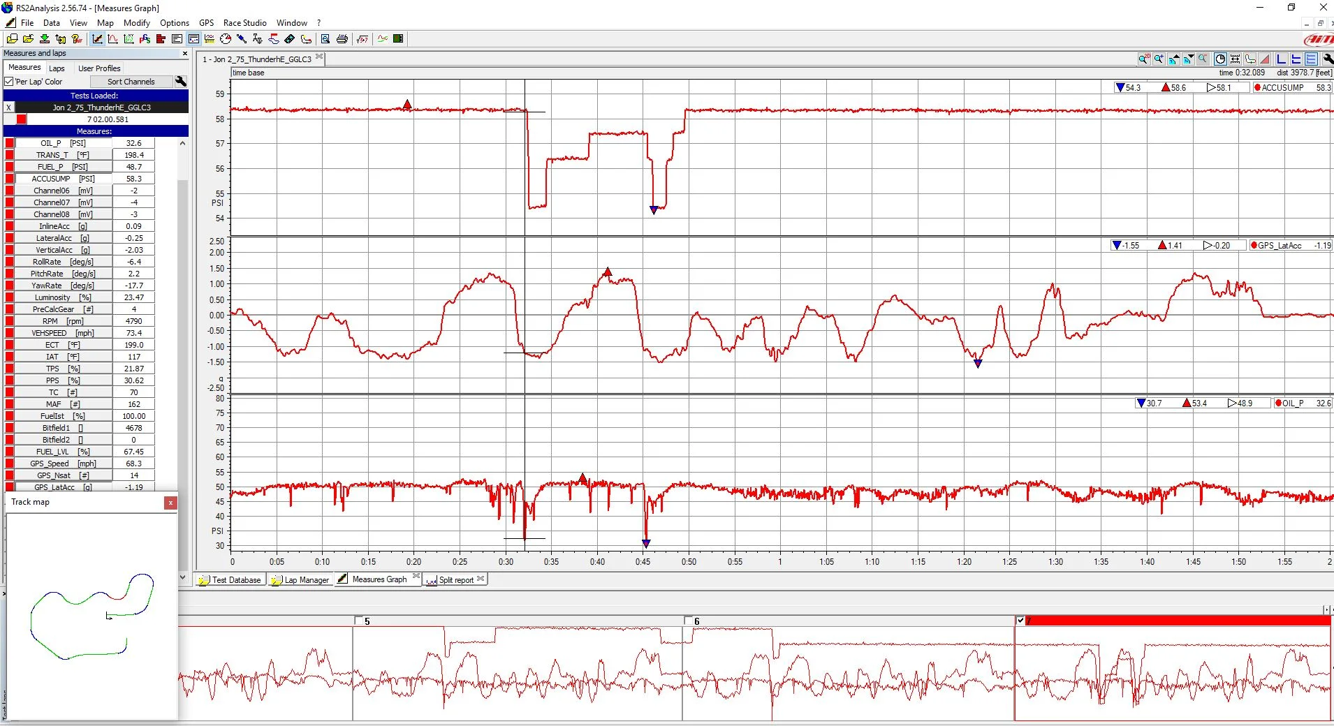 Finally, in the oil pressure graph, you can see where the oil pressure dropped for a second, but quickly came back up, thanks to the Accusump. Looks like it works!