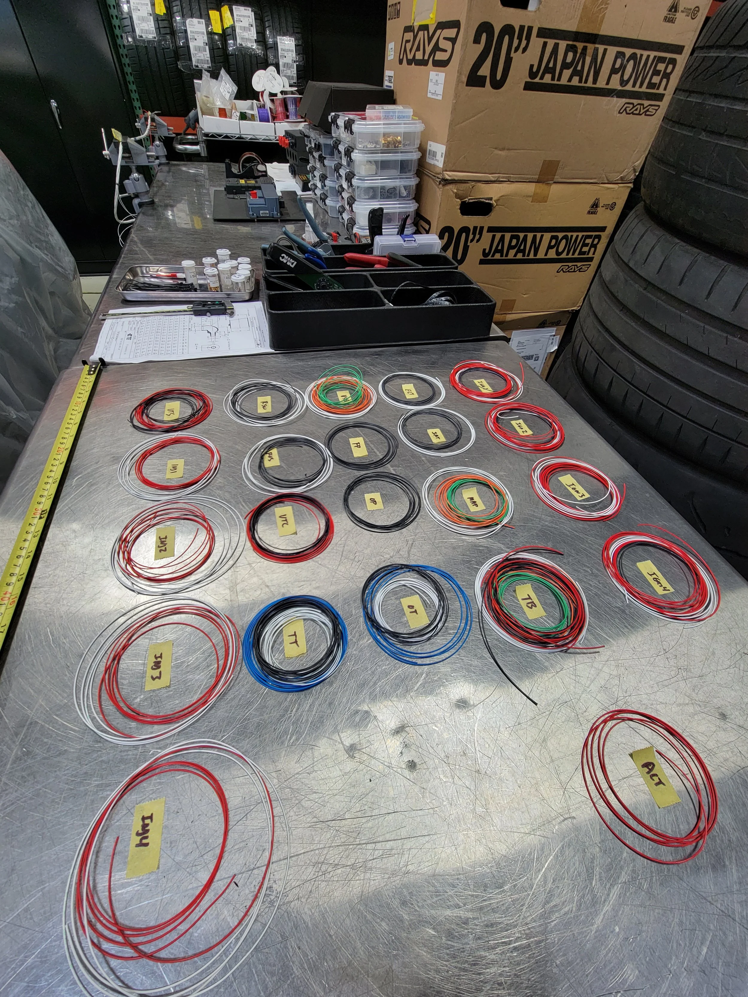 I like to start a harness off by cutting all the wires that I need to length and laying them out. I will then strip the ends, crimp on the pins and put them into the connector that I’m working with. Once the connector is fully pinned, I’ll pull up my spreadsheet and start twisting.