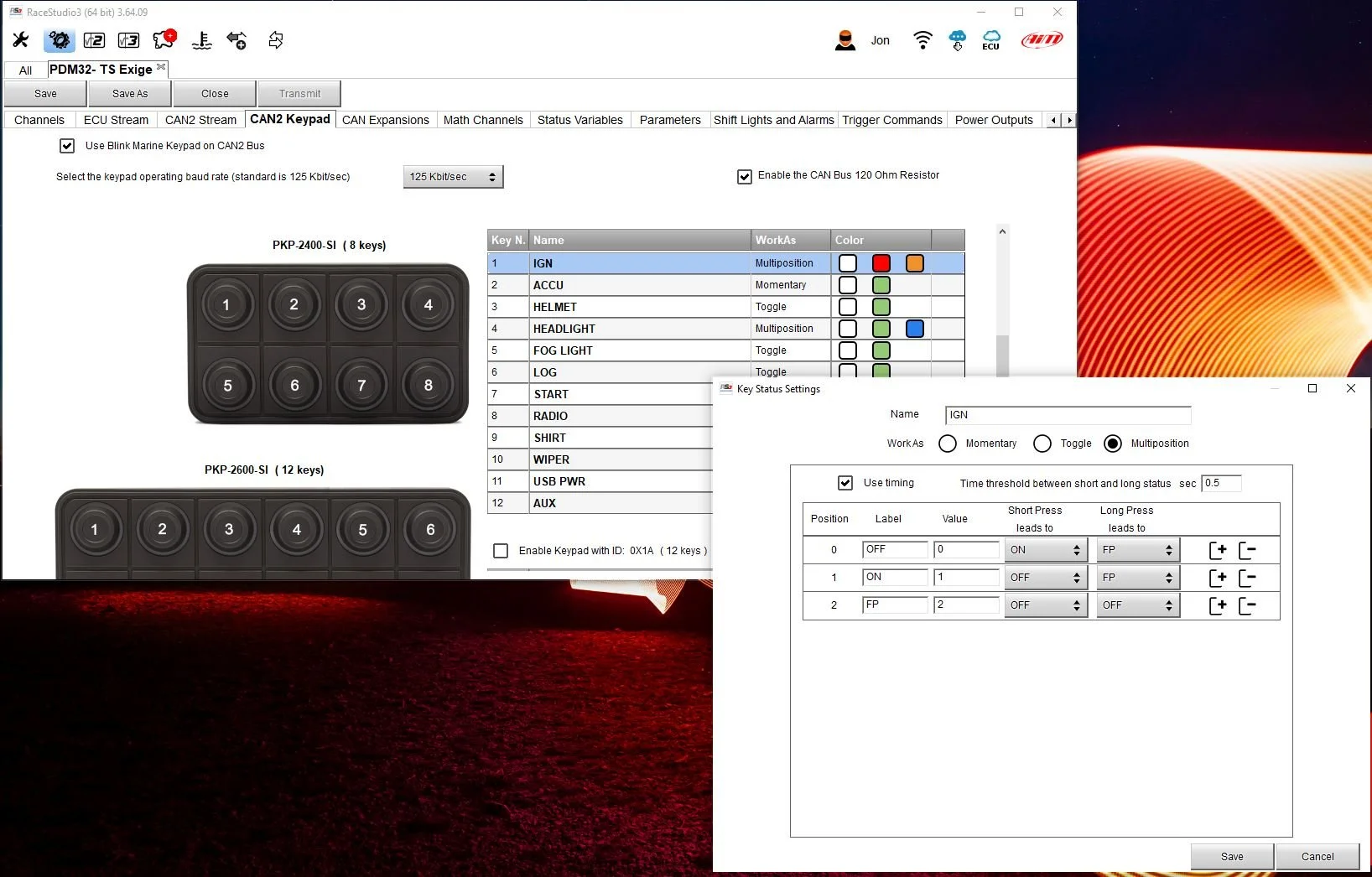 I can also override the fuel pump using the CAN keypad. In this case, I have set one of the buttons to equal “IGN” with a short press. This turns on the ignition power button. With a long press, the button equals, “FP”. This will activate the fuel pump. This can be useful to draining the fuel tank or diagnostic work.