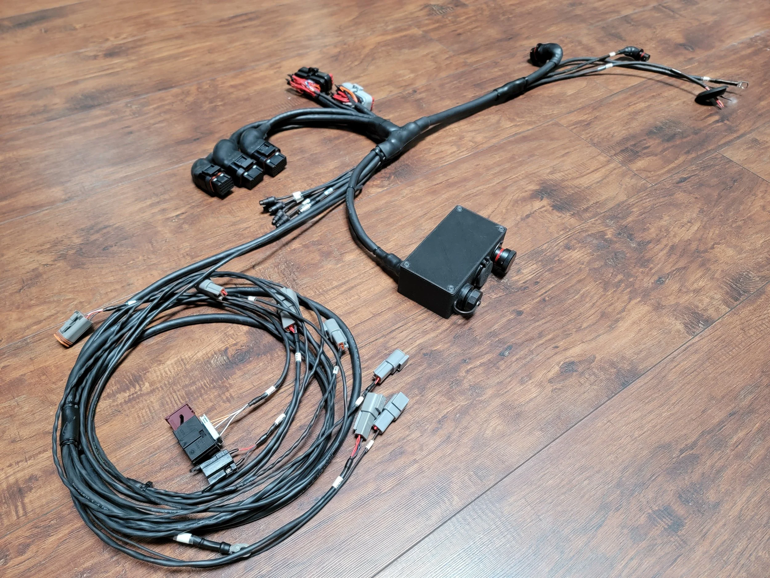This is the completed harness, which is lighter and nicer looking than what came out of the car. Every connector is labelled to prevent confusion when things have to come back apart in the future.