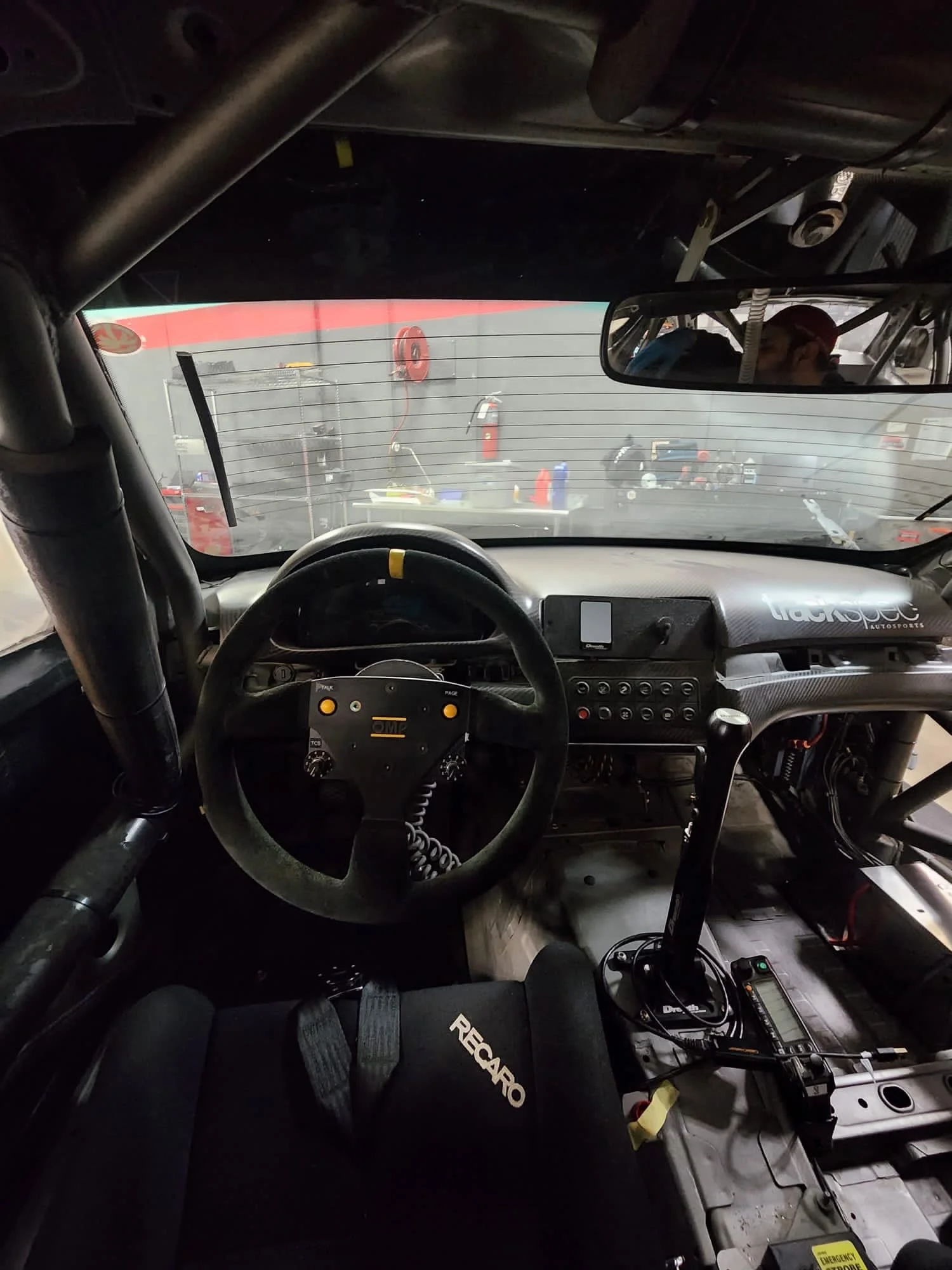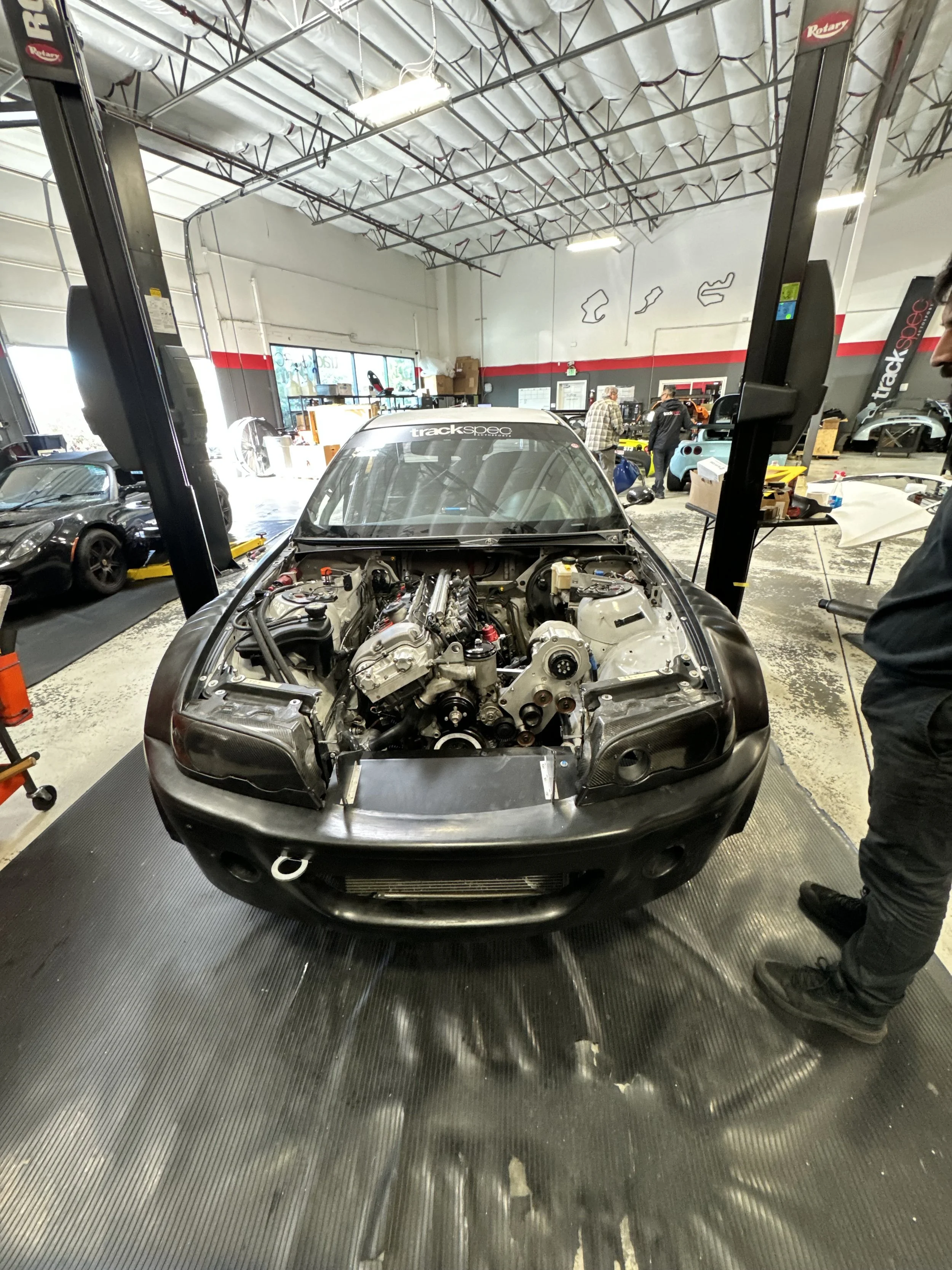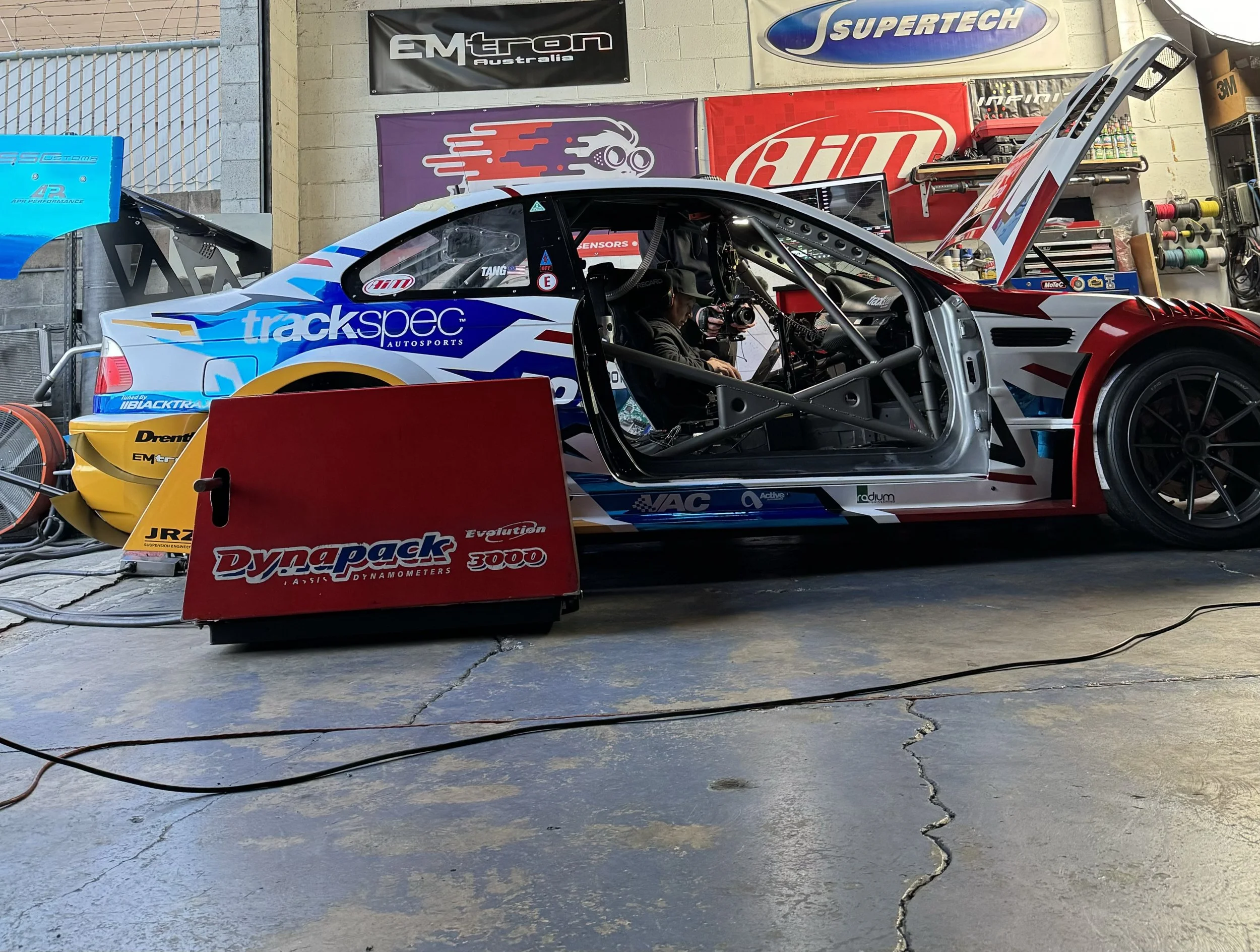 Then it was time to prepare for our first shakedown of 2024. We brought the car over to Jei at Blacktrax for break-in and tuning of the new built motor. The Flossman kit is so wide, the car just barely fits on the Dynapack. Phew!
