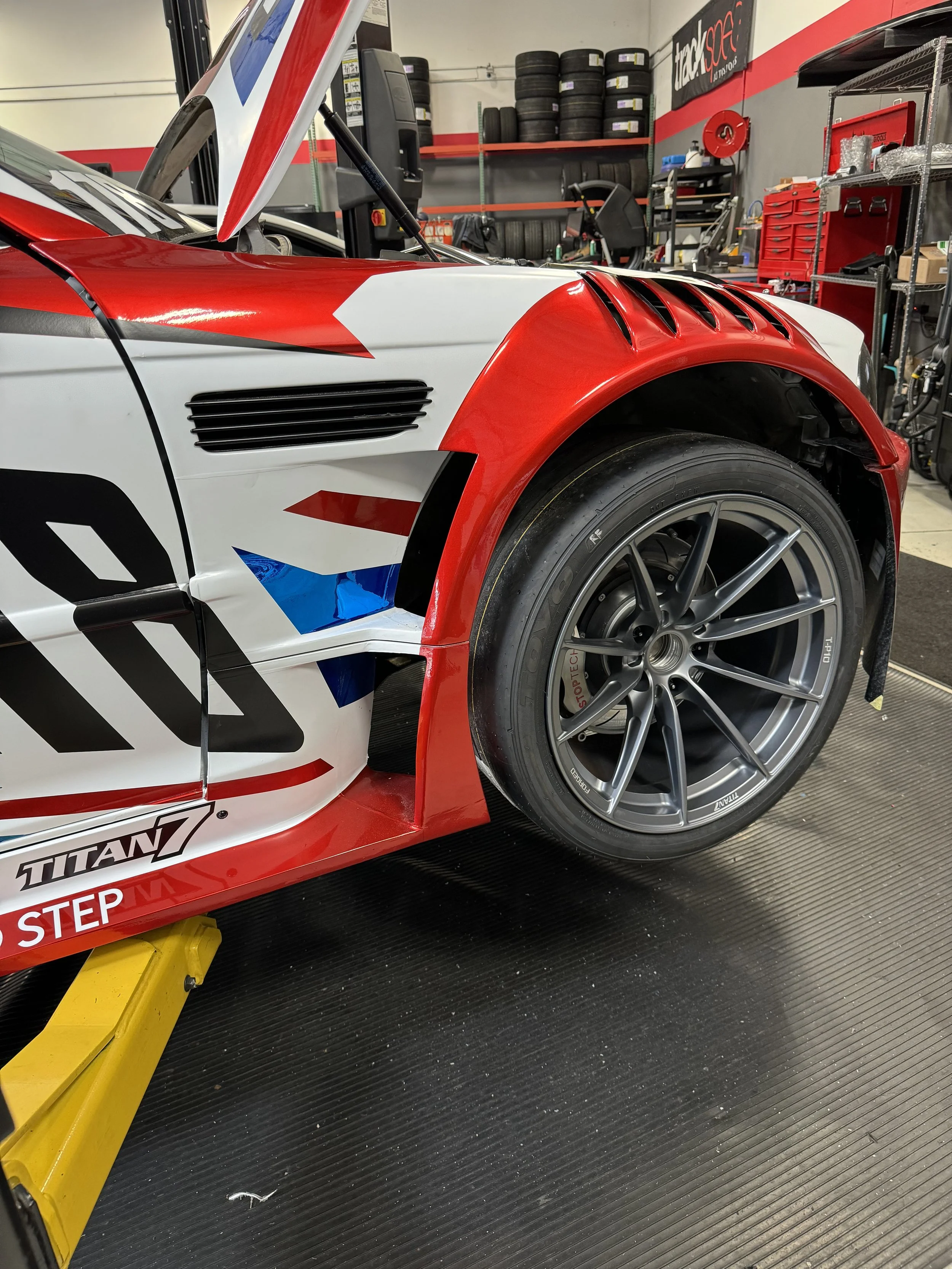 The old 18x10 T-S5 wheels look pretty small in the back now that the car is so wide. Fortunately, new wheels also arrived from our partners at Titan-7. The T-P10 design is so damn good looking! And they are ridiculously light and strong for their size! These are our new fronts, 18x11 +20ET. We will be running 18x12 in the rear later once those arrive.