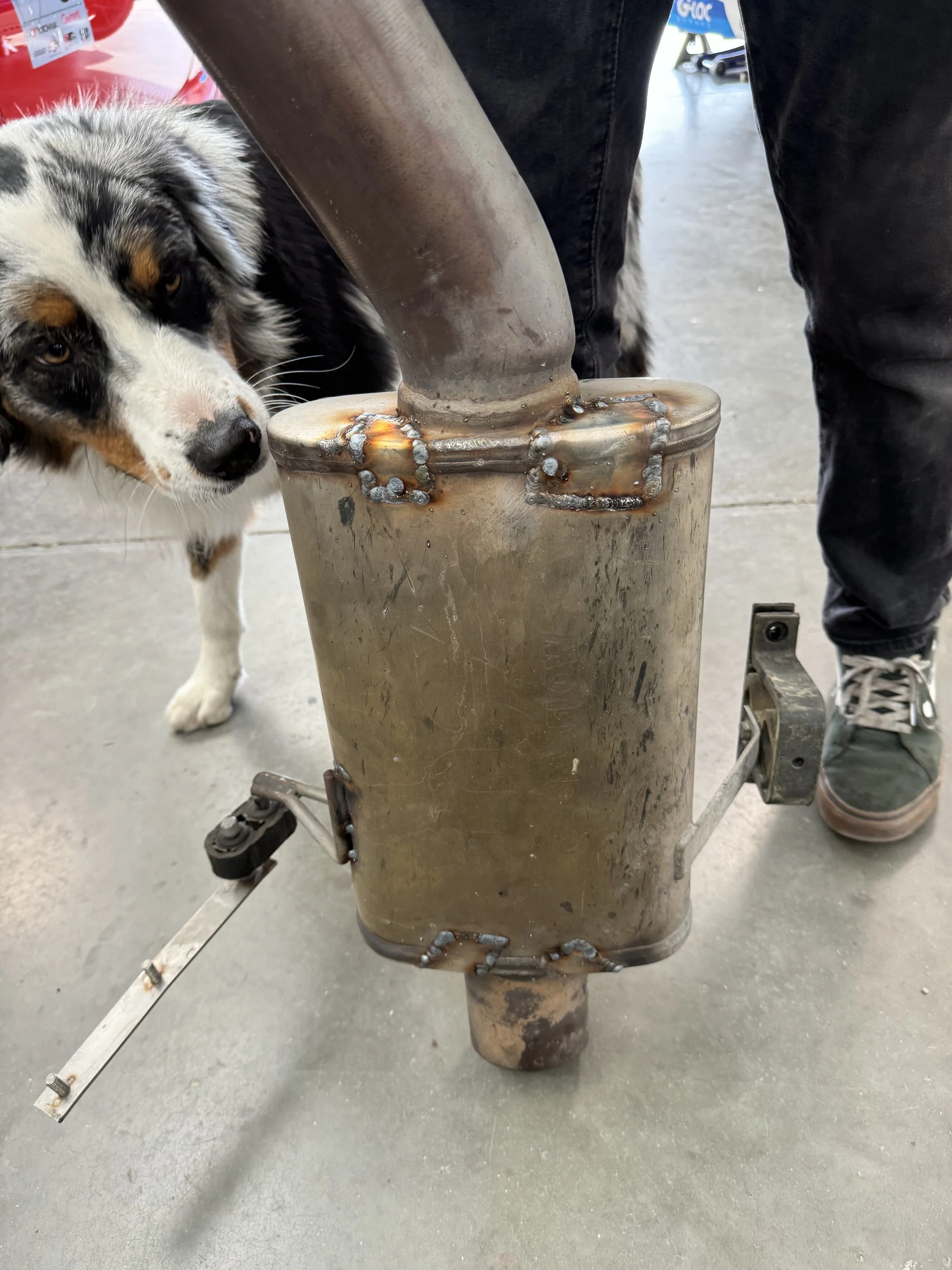 Friday practice threw quite a few curve-balls at us. We blew out our already tired muffler early in the morning and ended up welding some reinforcement plates on both ends to ensure it lasted for the event. Son’s dog, Camber, approves.